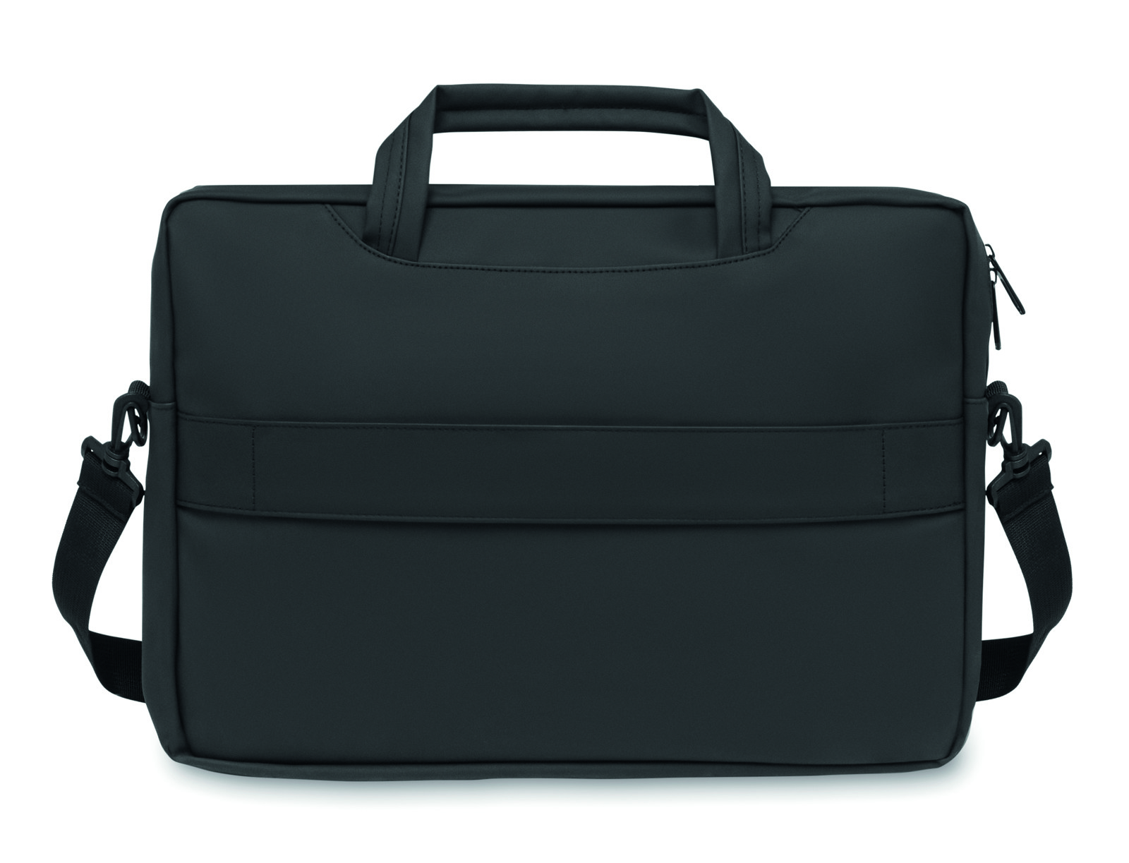 15 inch laptop document bag in soft PU with padded back . One main padded laptop compartment and zippered front pocket with several compartments. 210D RPET polyester lining. 2 handles and one adjustable and detachable shoulder strap with protection and trolley holder on back side.