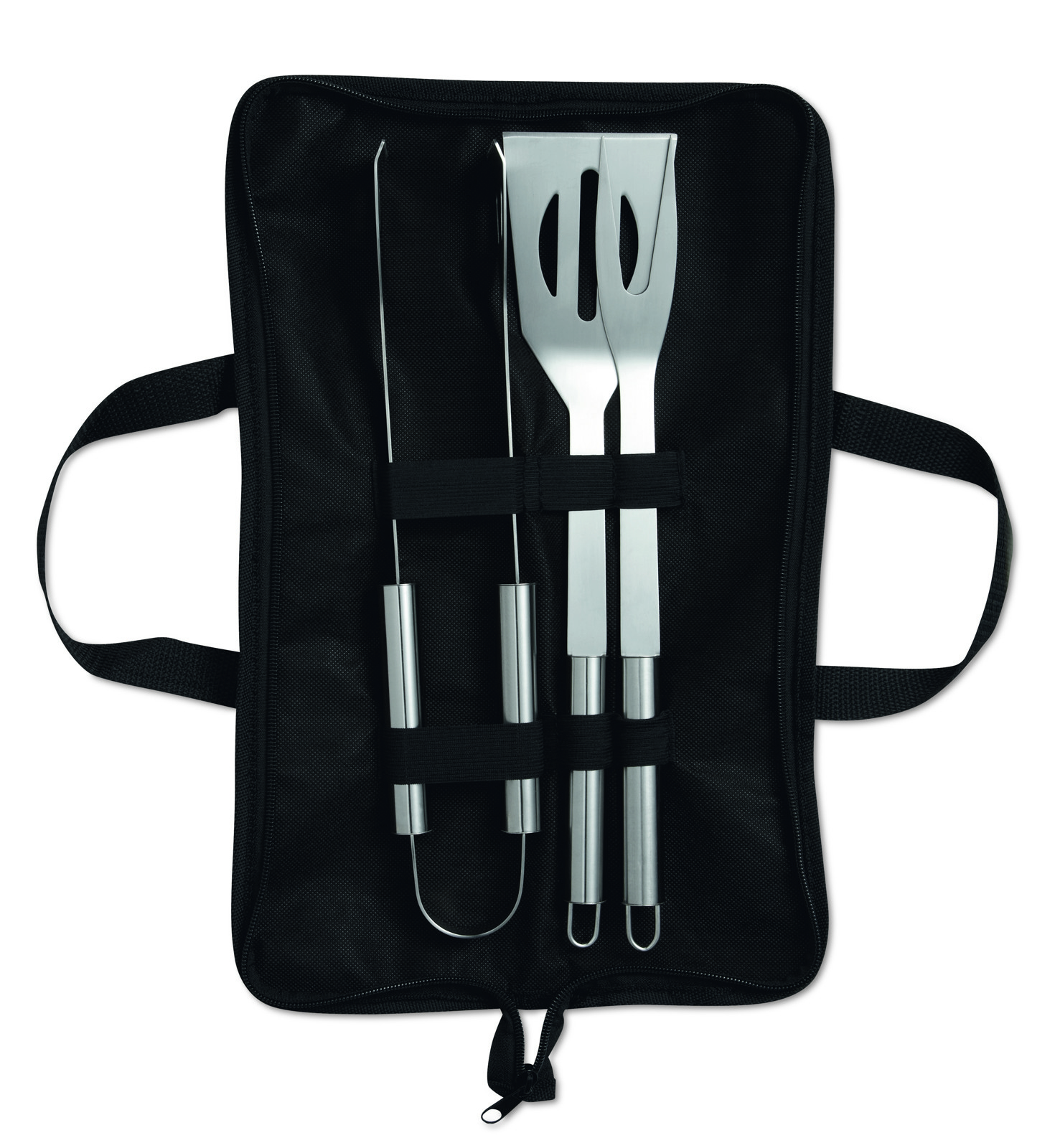 Set of 3 stainless steel barbecue tools in nonwoven pouch with zipper.