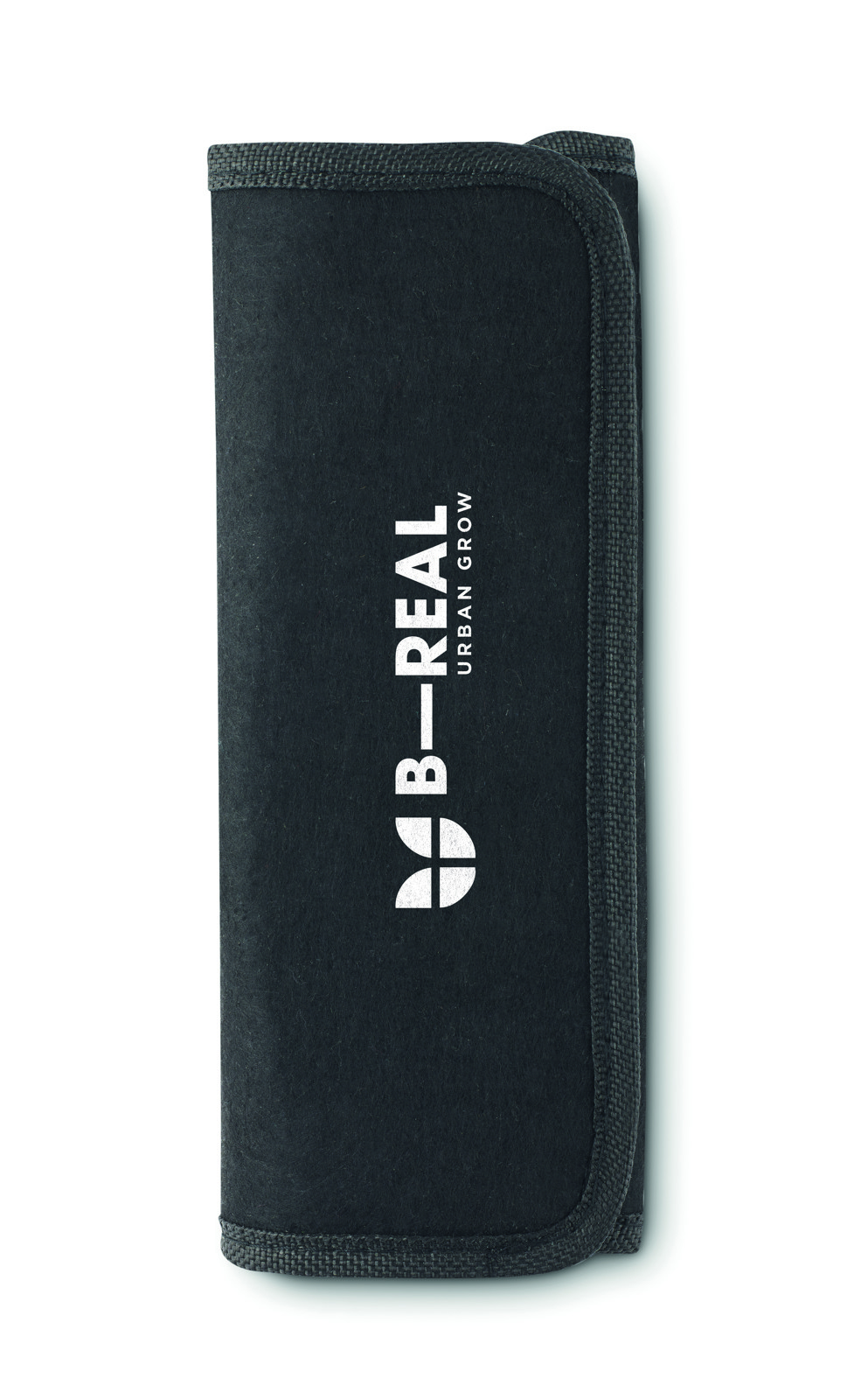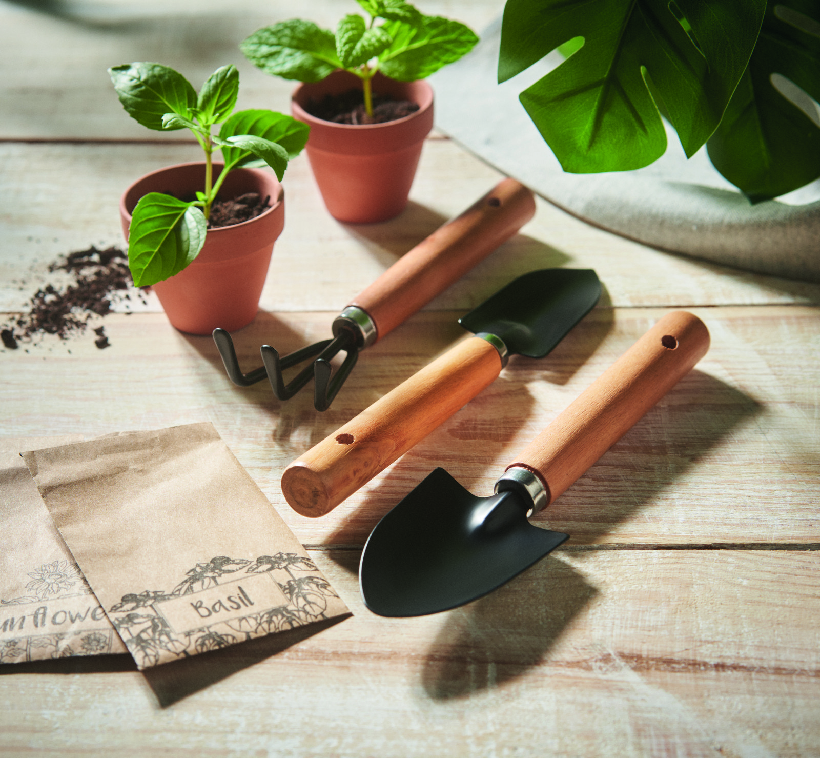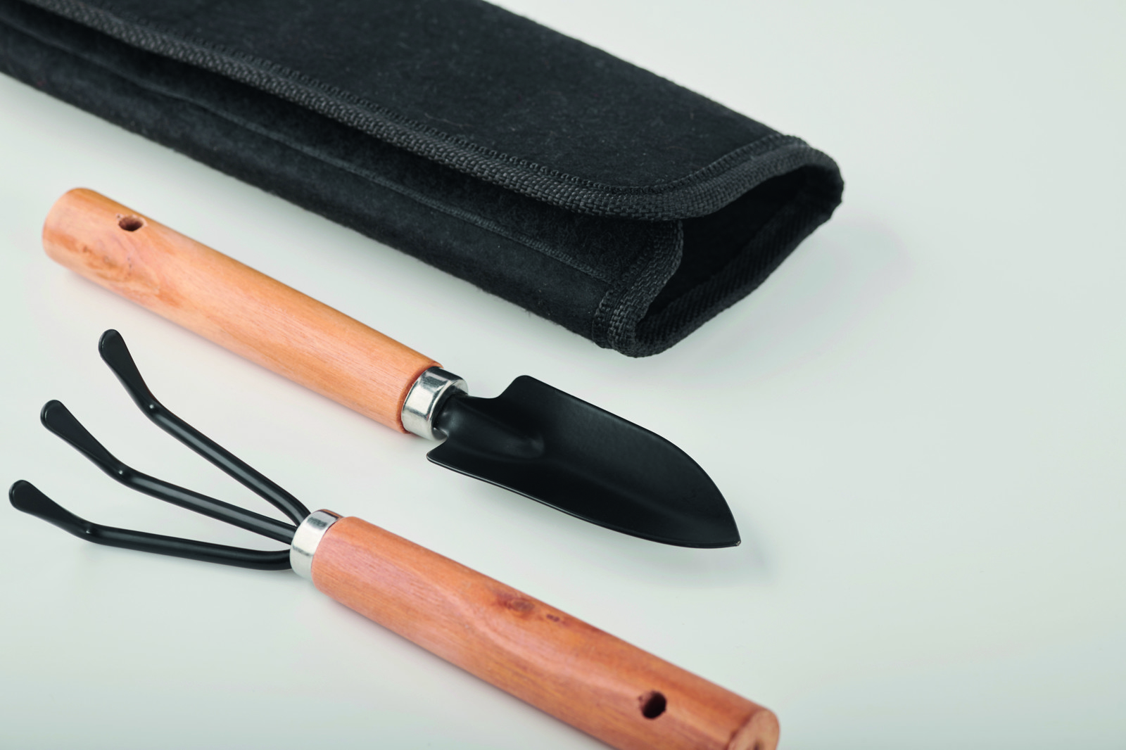 Set of 3 garden tools. Harrow and 2 spades. Presented in RPET felt pouch with hook and look closure.