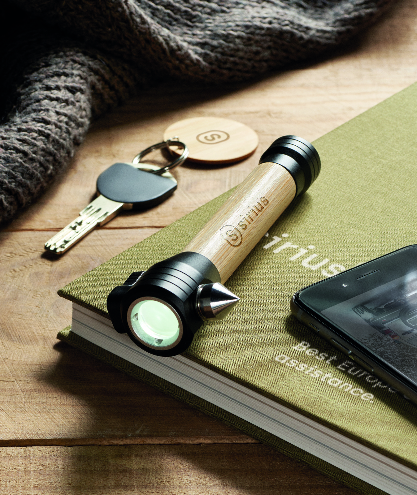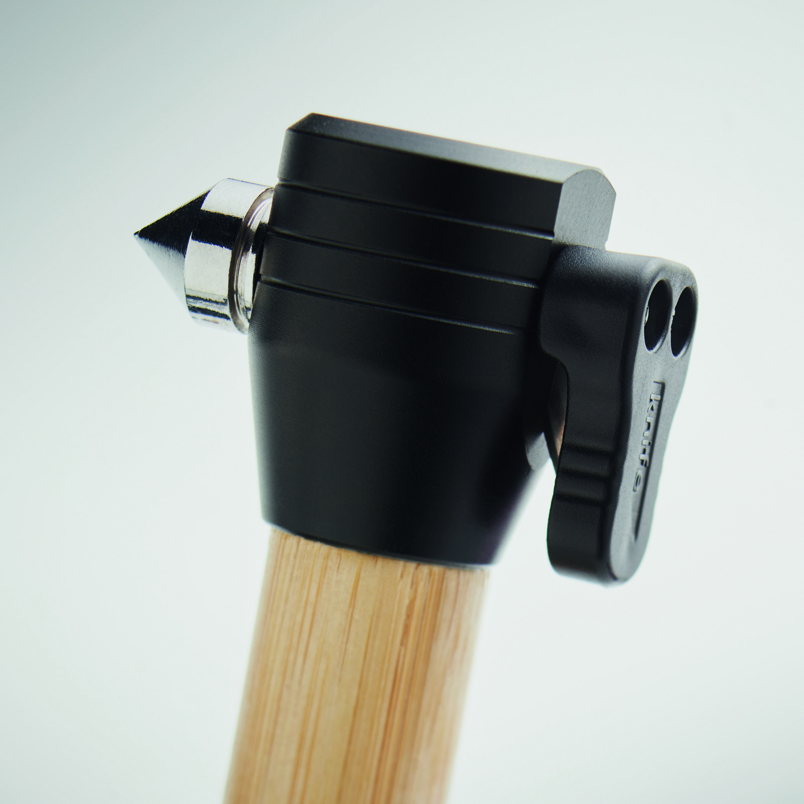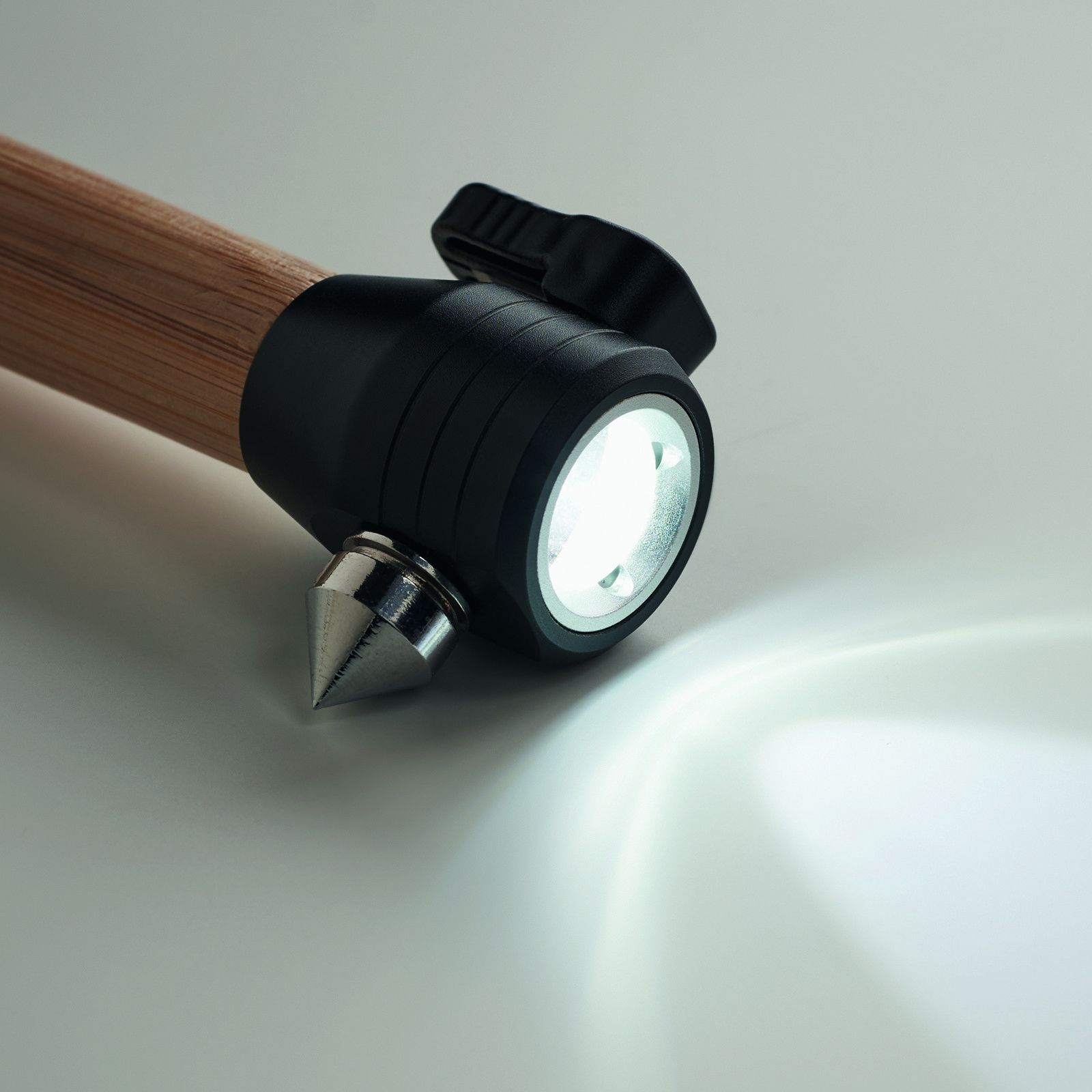 3 in 1 bamboo torch with emergency hammer and seat belt cutter. It has a magnetic base. Output lumen: 60. 2 AAA batteries excluded. Bamboo is a natural product, there may be slight variations in colour and size per item, which can affect the final decoration outcome.