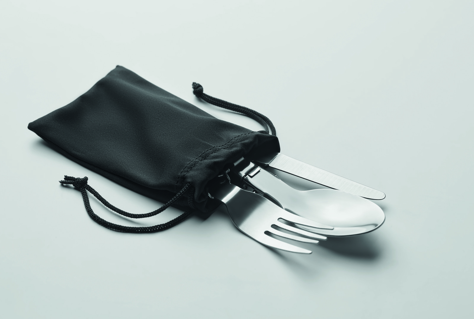 3-piece stainless steel camping utensils set in RPET pouch.
