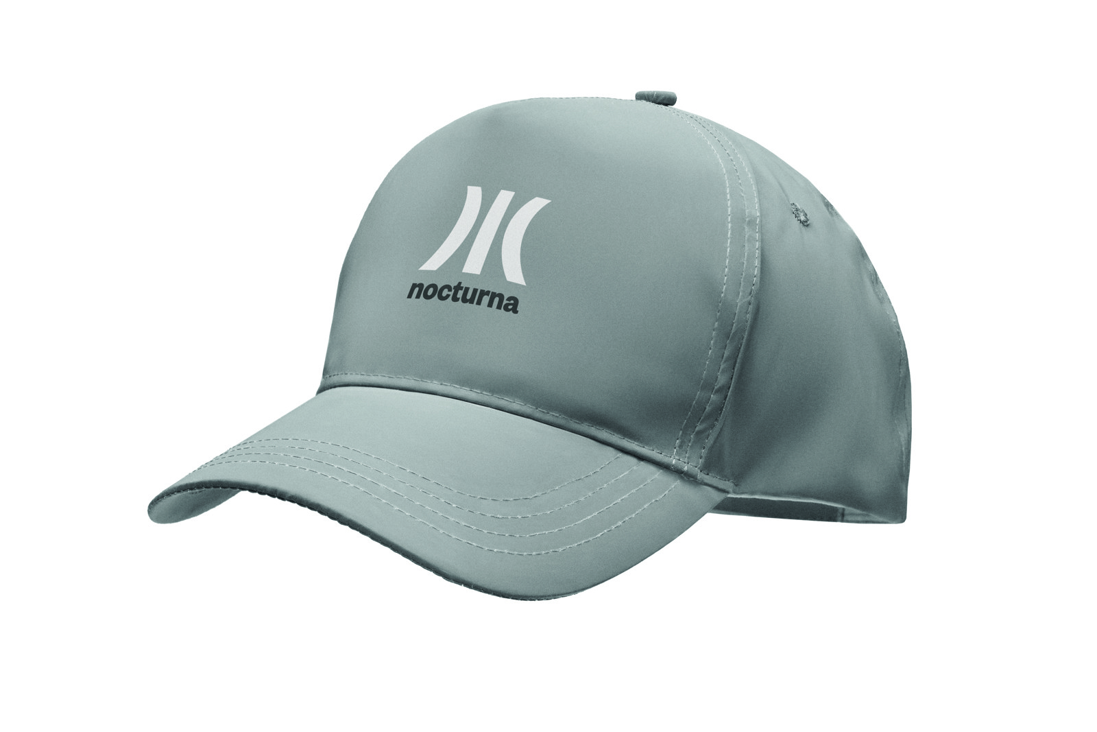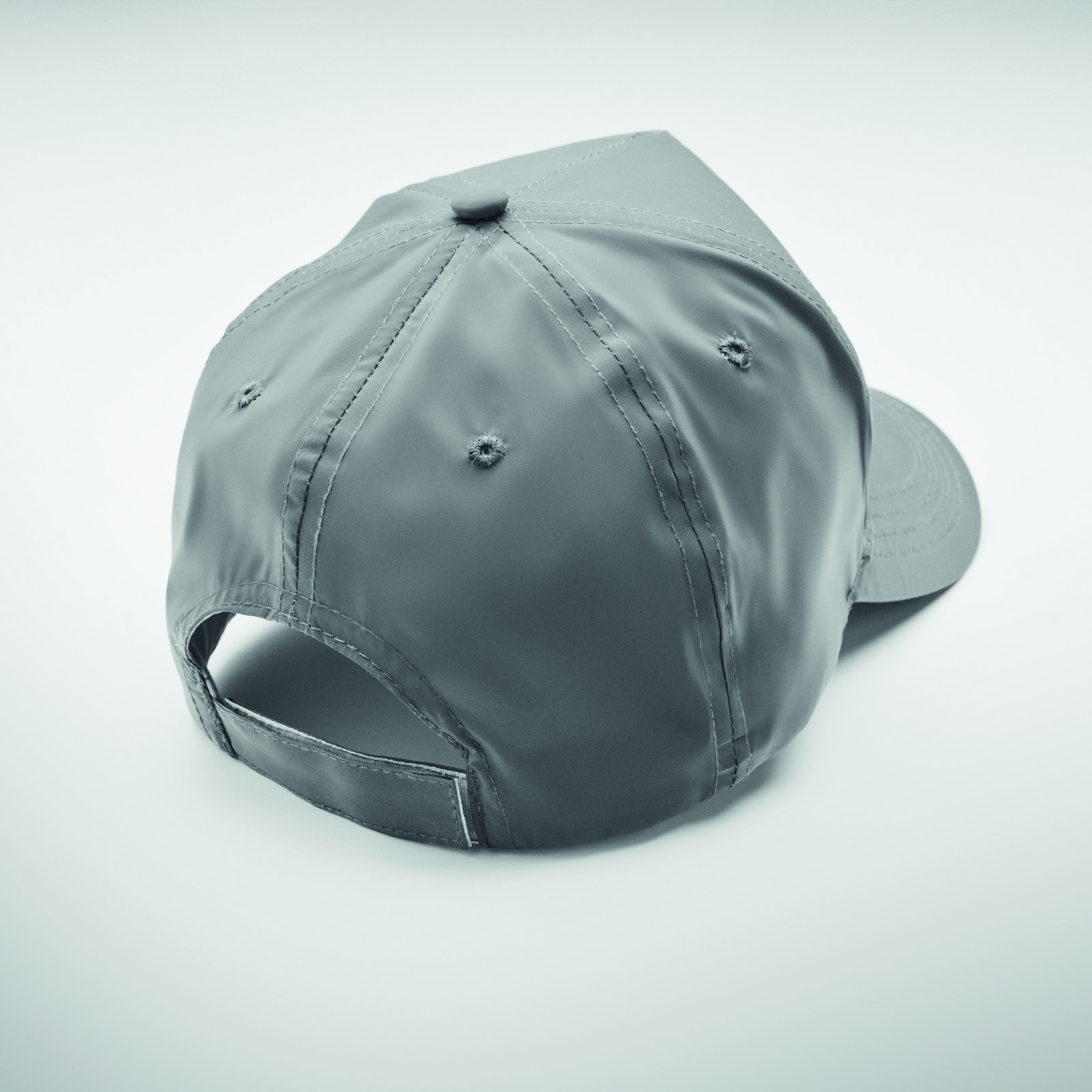 5 panel baseball cap in high reflective 190T polyester. 4 stitched eyelets with hook and loop closure. Size 7 1/4.