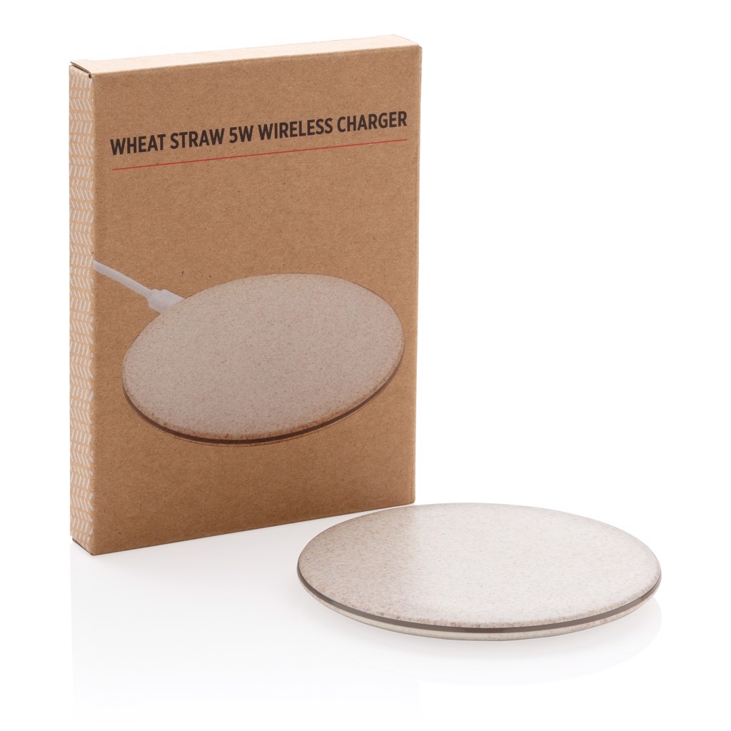 Ultra-flat 5W wireless charger to charge all wireless devices. Made out of a natural wheat fiber (35%) mixed with ABS. The LED indicator will light up when the device is charging. Compatible with all QI enabled devices like Android latest generation, iPhone 8 and up. Input: 5V/1,2A. Wireless Output: 5V/1A, 5W. Including 150 cm PVC free TPE micro USB cable.