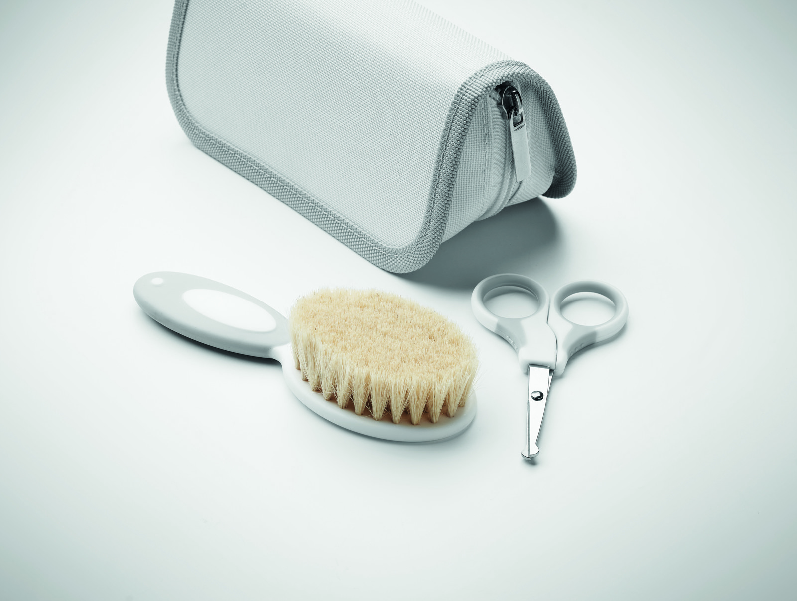 6 piece baby grooming set. Includes: gentle care brush, baby comb, tooth brush, nail file, nail clippers and scissors. Presented in 600D polyester bag.
