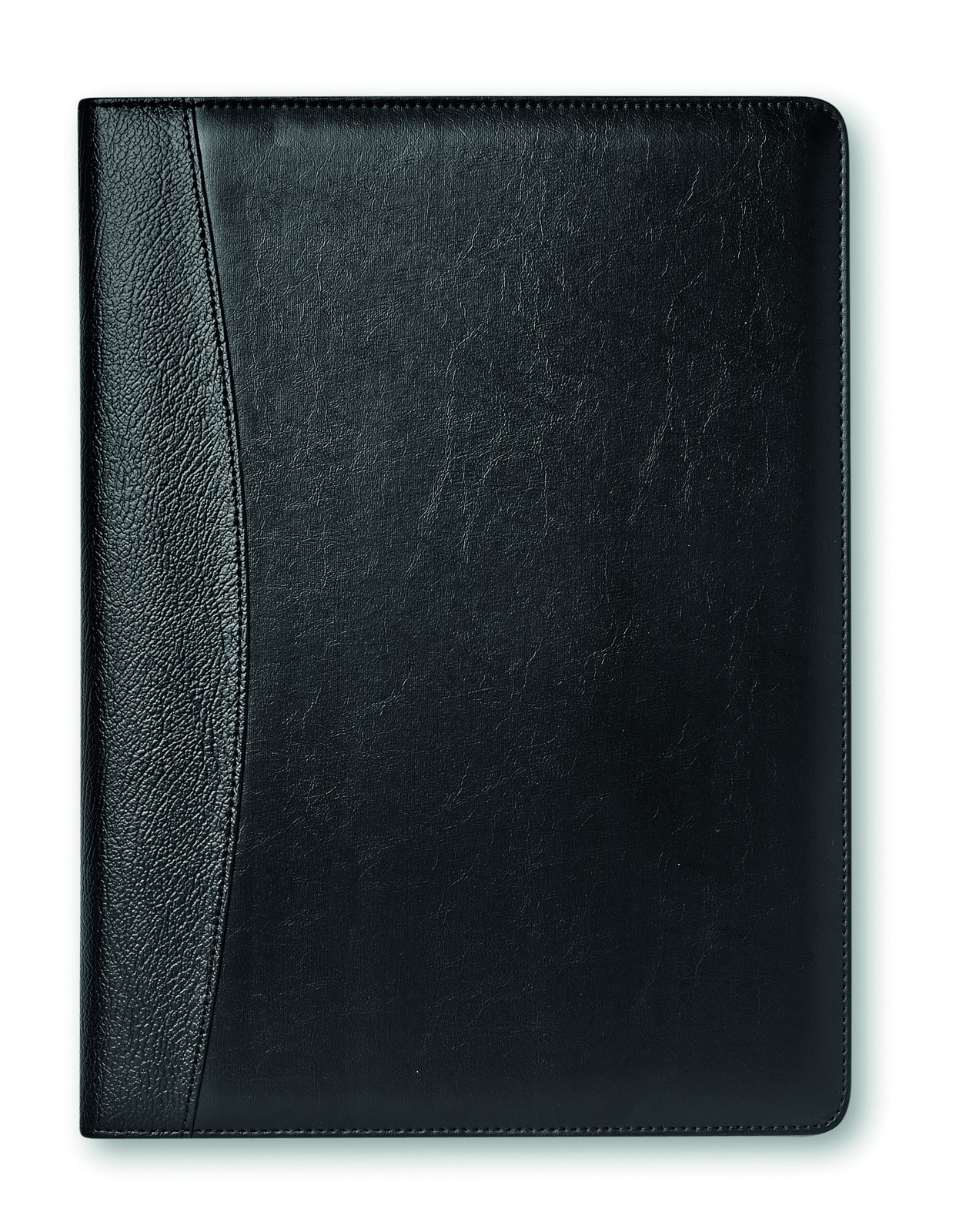 A4 faux leather portfolio. 20 lined sheets notepad. Solar powered calculator. Metal ball pen. Blue ink.