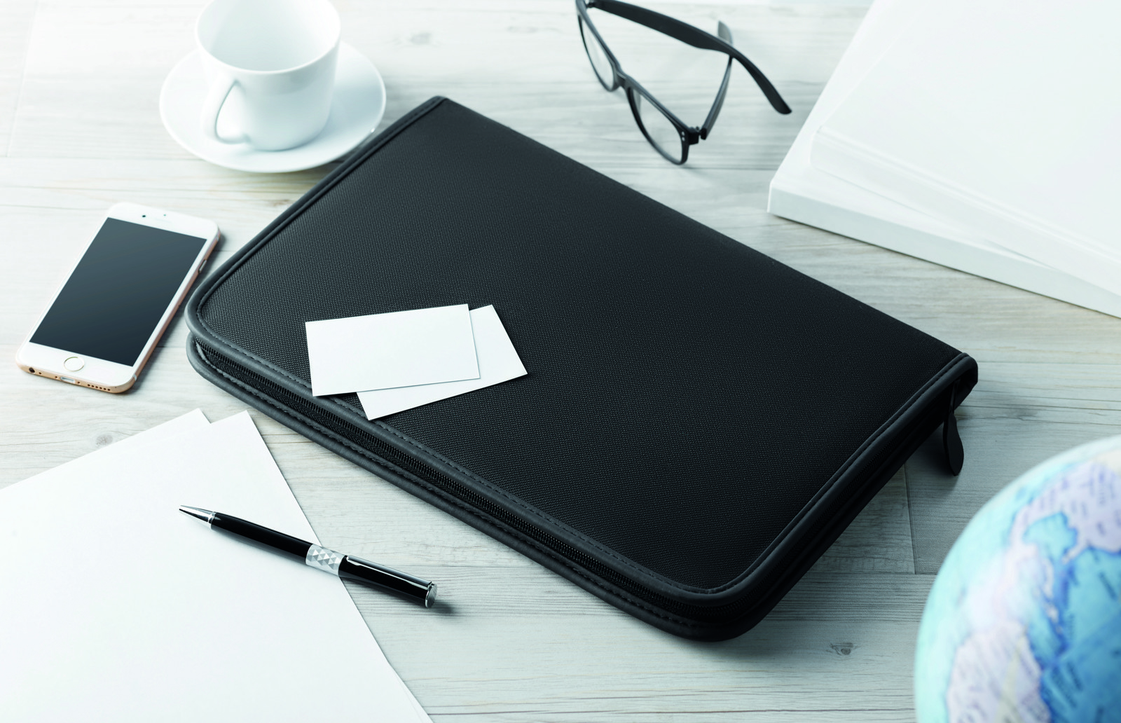 A4 conference folder. 600D polyester and 210T lining. Zipped. A4 20 lined recycled paper sheets notepad. 4 compartments. Card holer.