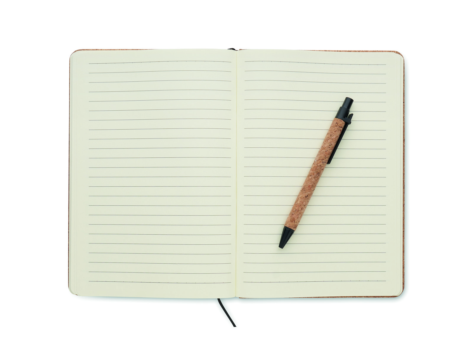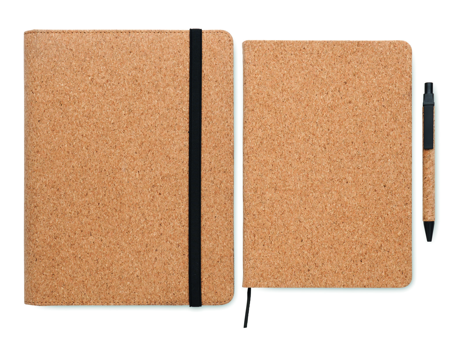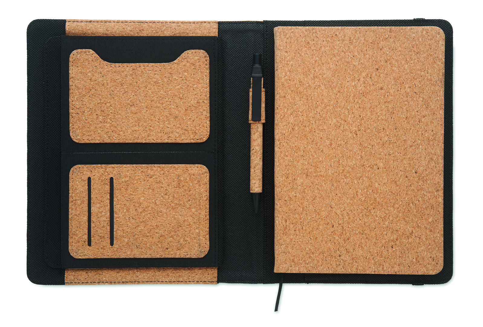A5 cork portfolio. Refillable A5 notebook with hard cork cover. Casebound. 192 recycled paper lined pages (96 sheets). Matching pen and pen holder. 2 card holders and one large compartment. Elastic closure strap.