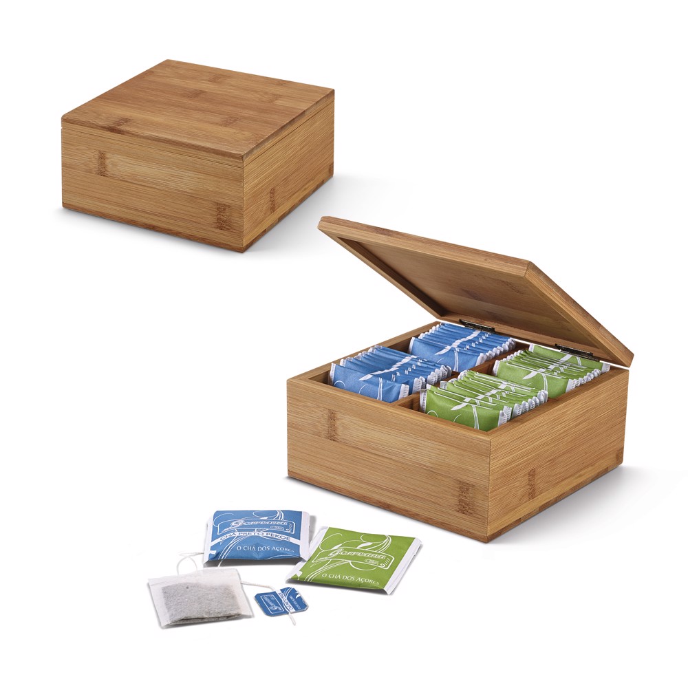 Bamboo tea box with 4 compartments and magnet closure. This tea box includes 40 tea bags of "Gorreana" Azores tea (20 bags of black tea and 20 bags of green tea). Supplied in a kraft box. As the product is made from natural materials, the colour and the printing result may vary between products. 160 x 160 x 78 mm | Kraft box: 166 x 166 x 85 mm