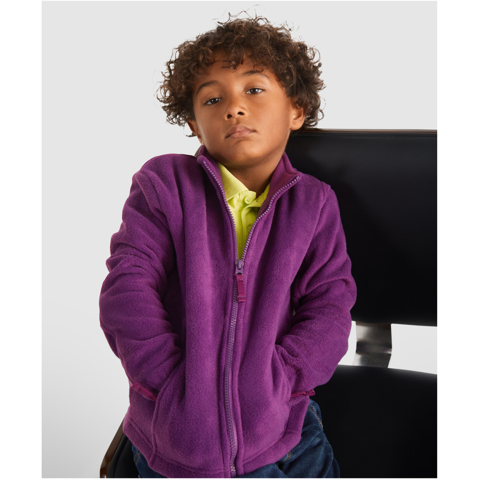 Fleece jacket with high lined collar and matching reinforced covered seams. Injected zip with matching puller made of fabric. Side pockets. Cuffs with elastic trim. Bottom hem with inner side adjusters. Removable label. The model is 115 cm and is wearing size 5/6.