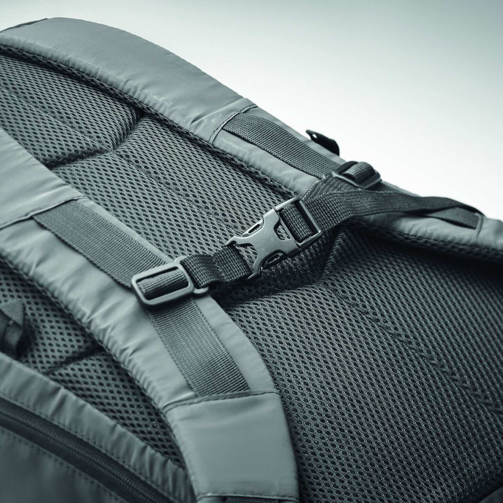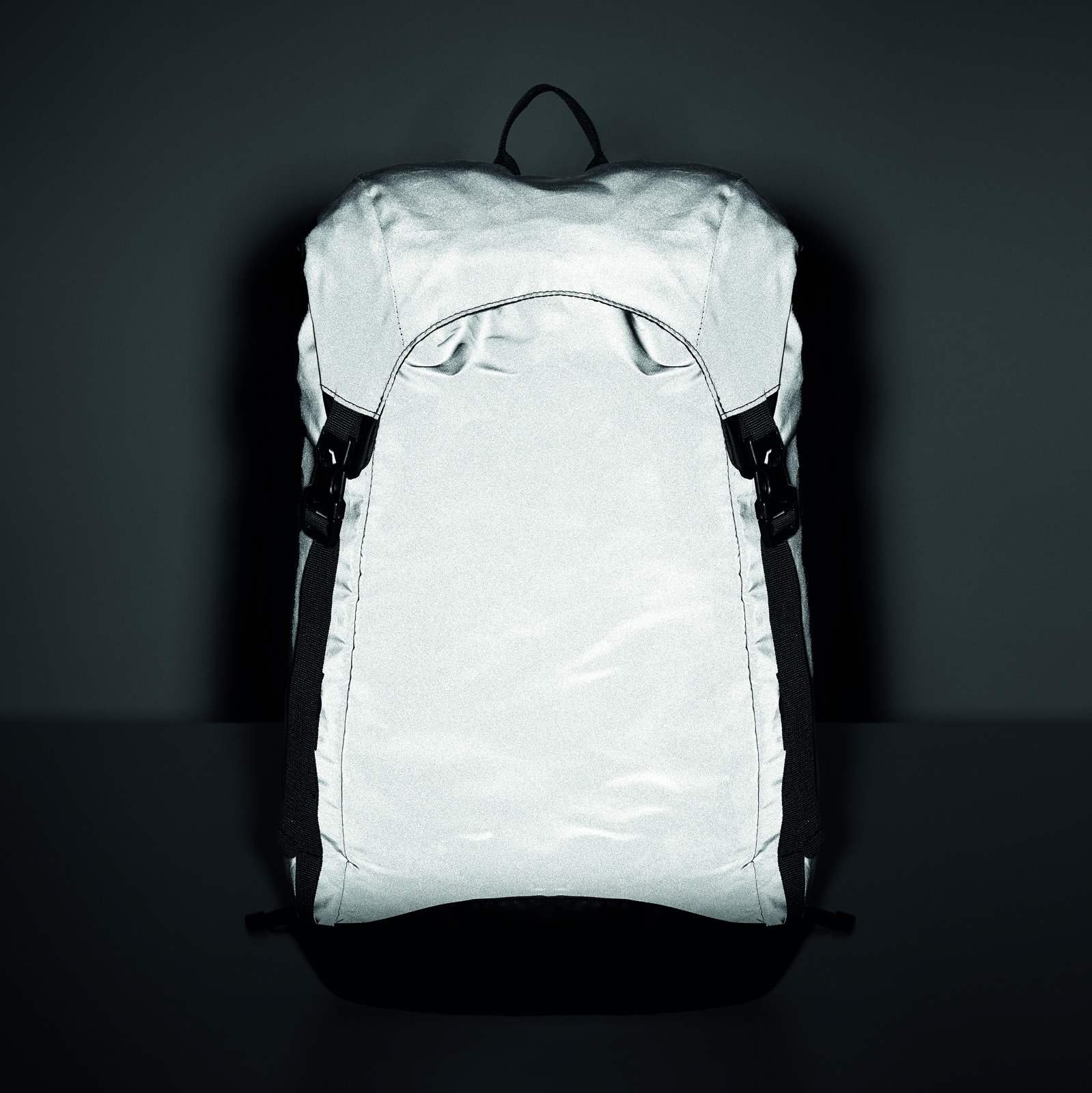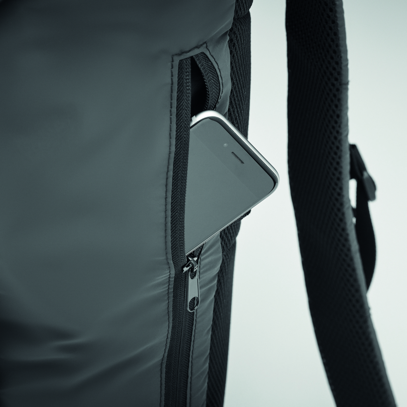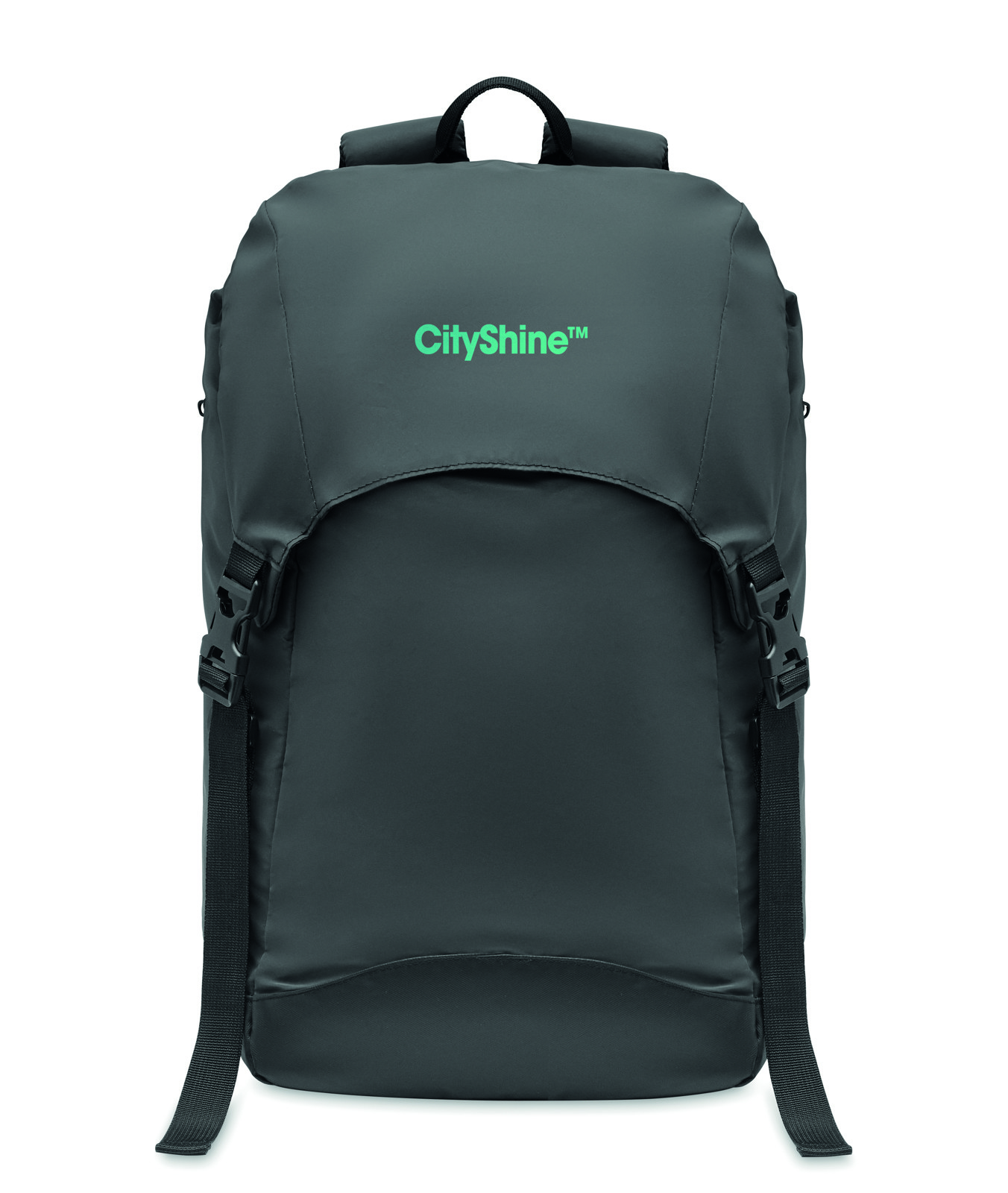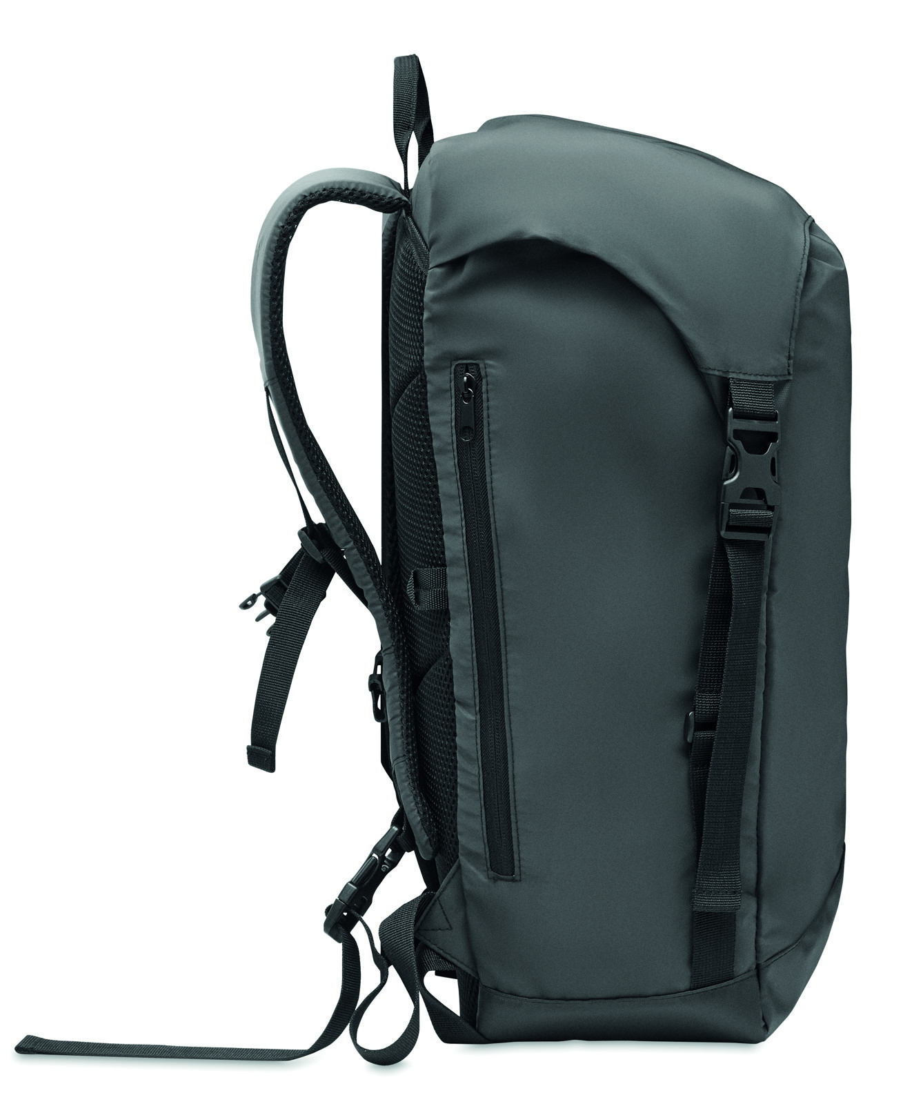 Outdoor backpack in 190T polyester coated with reflective granules. Side zippered outer pocket and padded back, inner lining with drawcord closure. One large padded inner laptop compartment. It has adjustable padded shoulder straps and adjustable chest and waist strap with buckle closure. Water repellent.