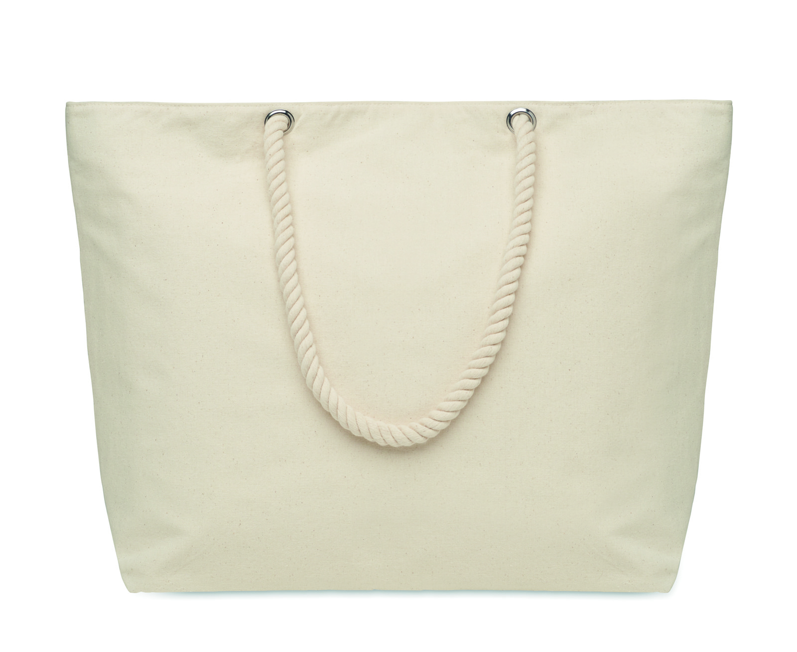 Zippered beach cooler bag in cotton with cord handle. 220 gr/m². 2mm aluminium foil insulation.