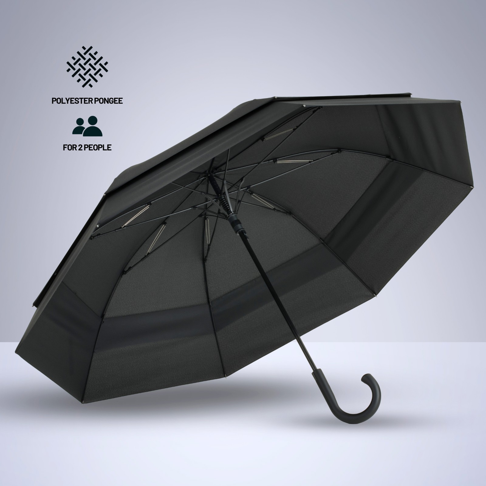 A durable and stylish umbrella with a 128 cm canopy made from 190 pongee fabric. Features a strong steel and fiberglass frame, ABS plastic handle, and an automatic open function for easy use. REACH certified.