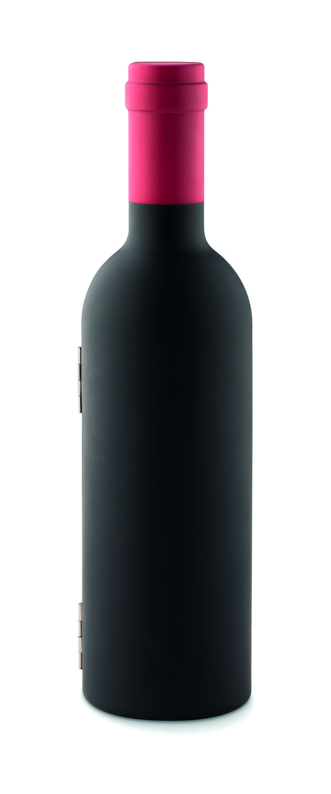 Wine set presented in bottle shaped box. With wine stopper, corkscrew and anti drip collar. Magnetic closing.