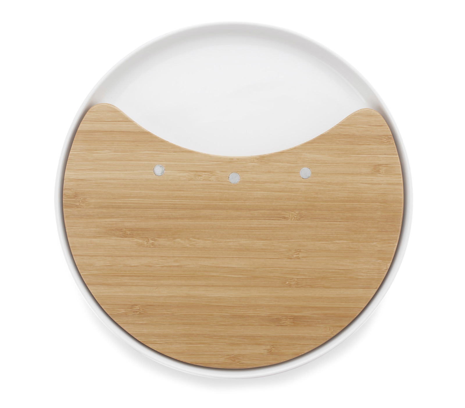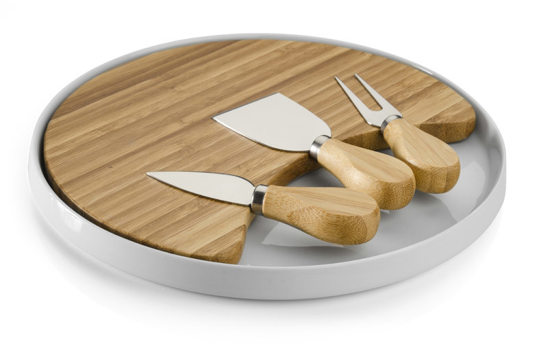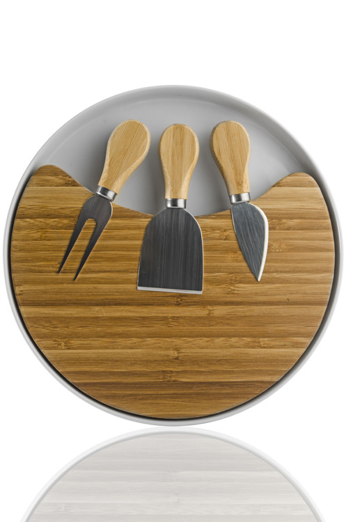 The CHEDDAR cheese board is an elegant set for serving cheese. The CHEDDAR set is a must for meetings over a glass of wine. It includes a bamboo board, a ceramic stand and three knives.