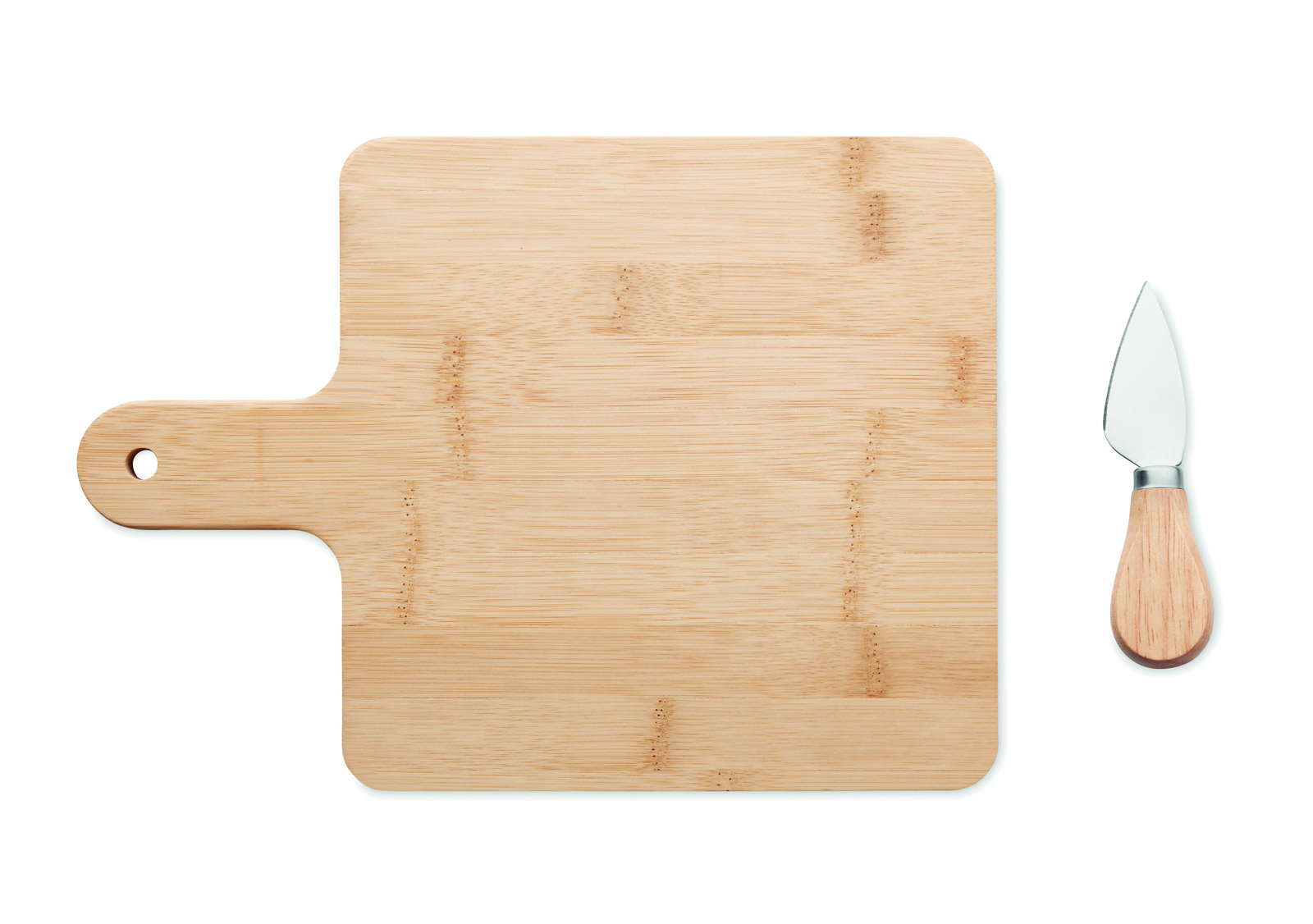 Bamboo Cheese set serving board with serving knife. Bamboo is a natural product, there may be slight variations in colour and size per item, which can affect the final decoration outcome.
