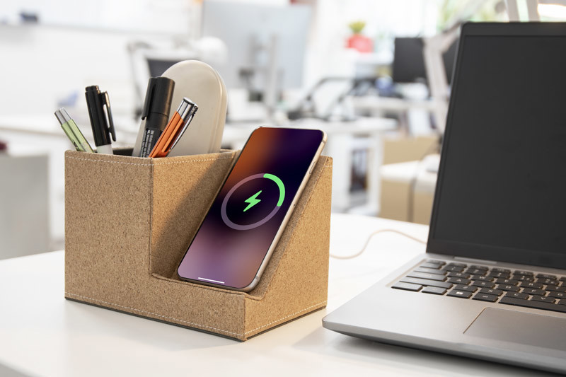 COVBI is a functional desk organiser made of natural cork. The gadget combines a toolbox for writing accessories with a 15W wireless charger, ideal for fast phone charging. In addition, a USB-C cable is included for a quick and secure power connection. COVBI will bring order and modern technology to your workspace.