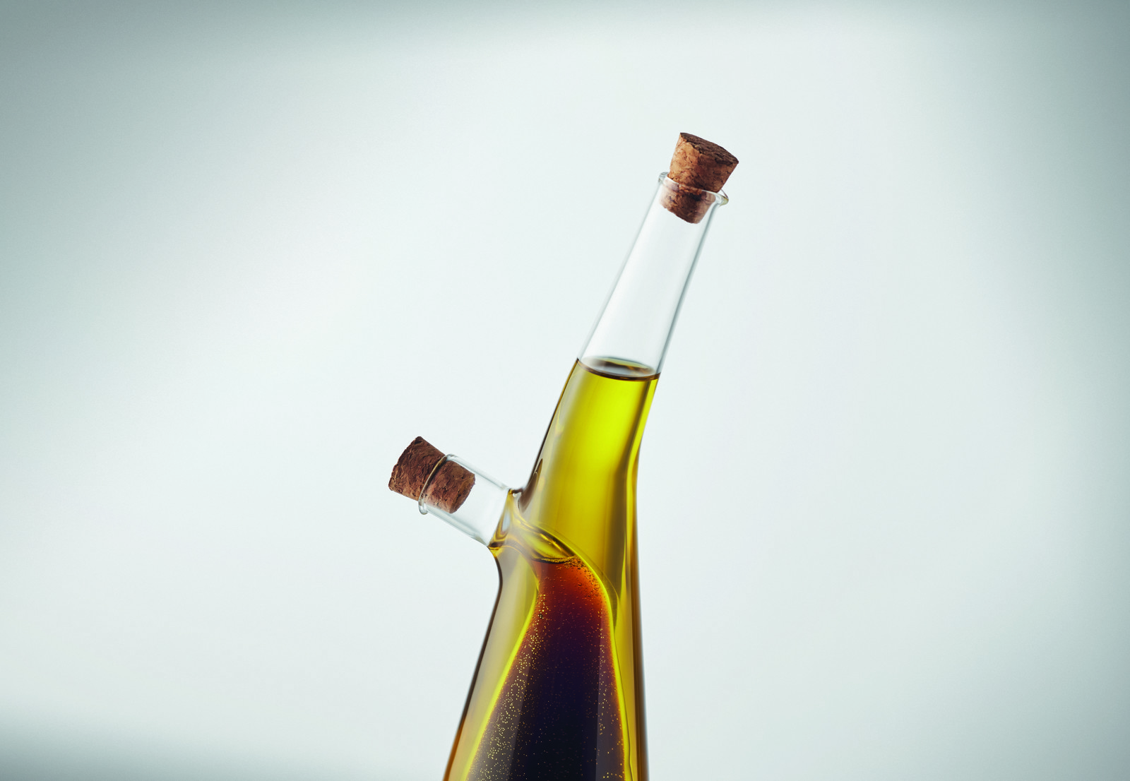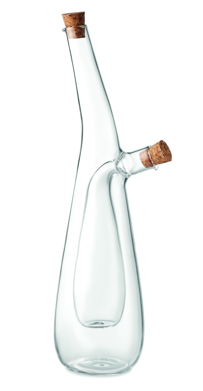 Borosilicate glass oil and vinegar bottle with cork stoppers. Capacity outer: 300 ml. Capacity inner: 80 ml. Cork is 100% natural material. Due to its structural nature and surface porosity the final print result per item may have deviations.