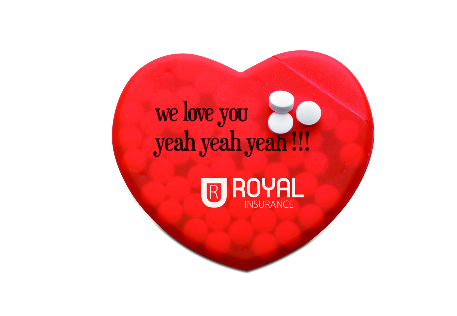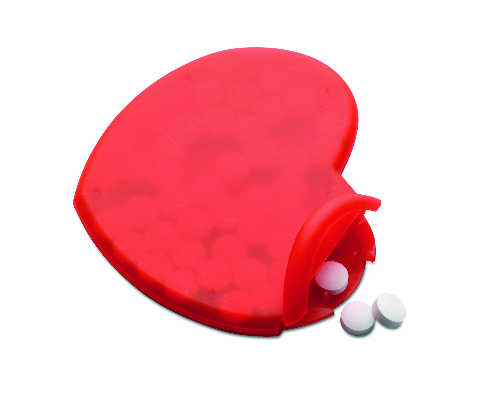 Heart shaped polypropylene plastic mint box dispenser. Contains 8 grams of mint.