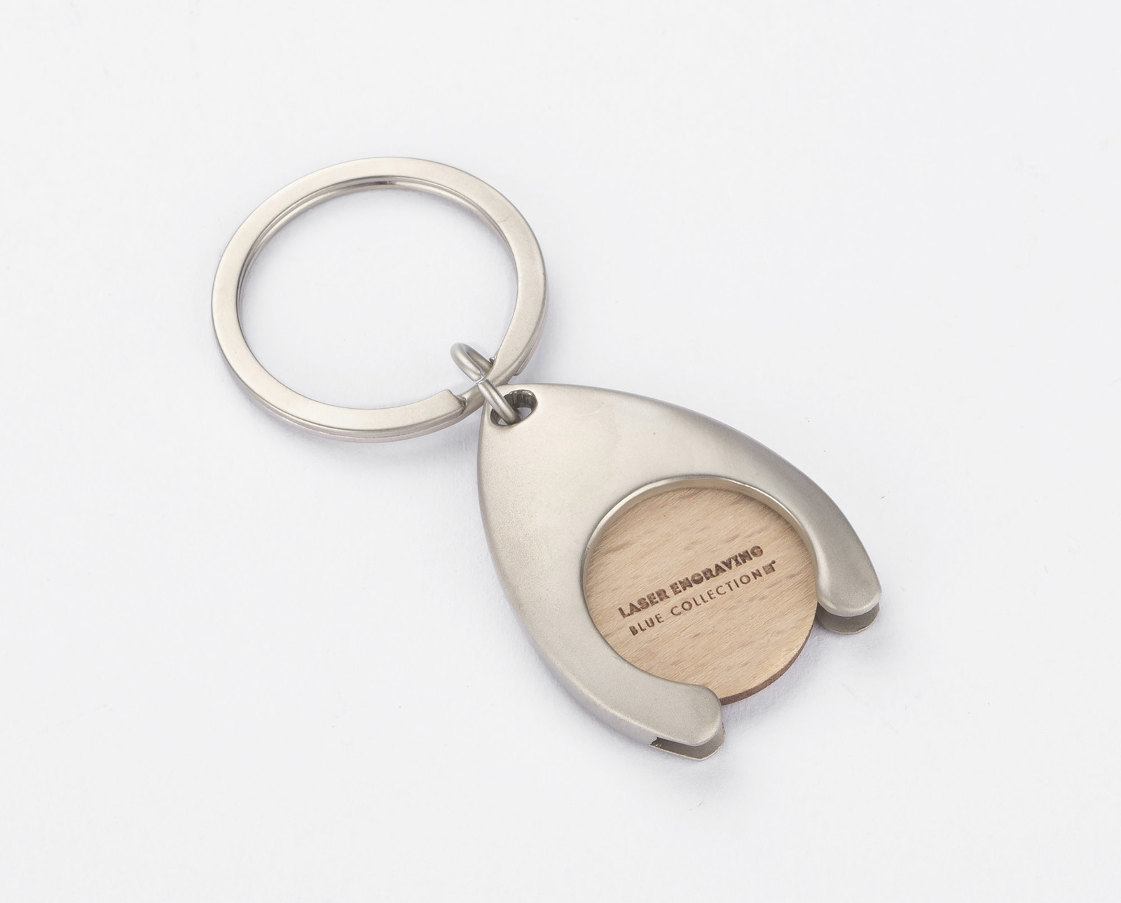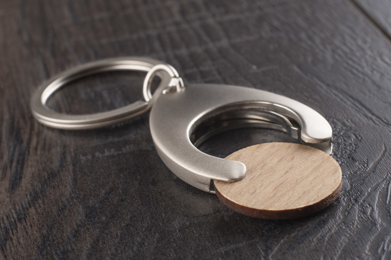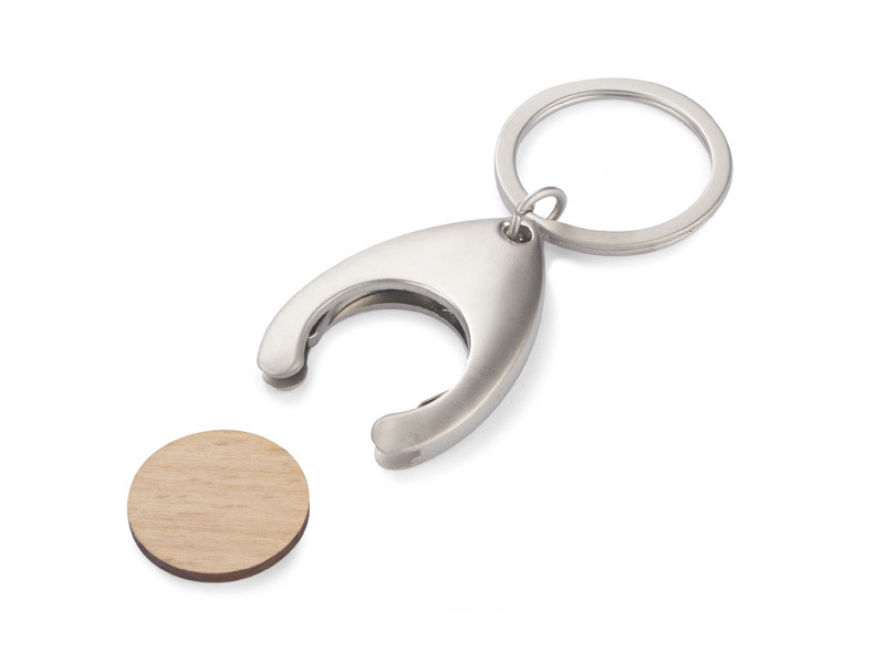 Metal keyring with a token made of recycled furniture wood. The token fits in shopping carts. Packed in a brown envelope.