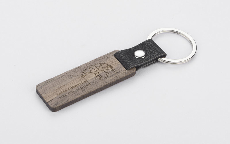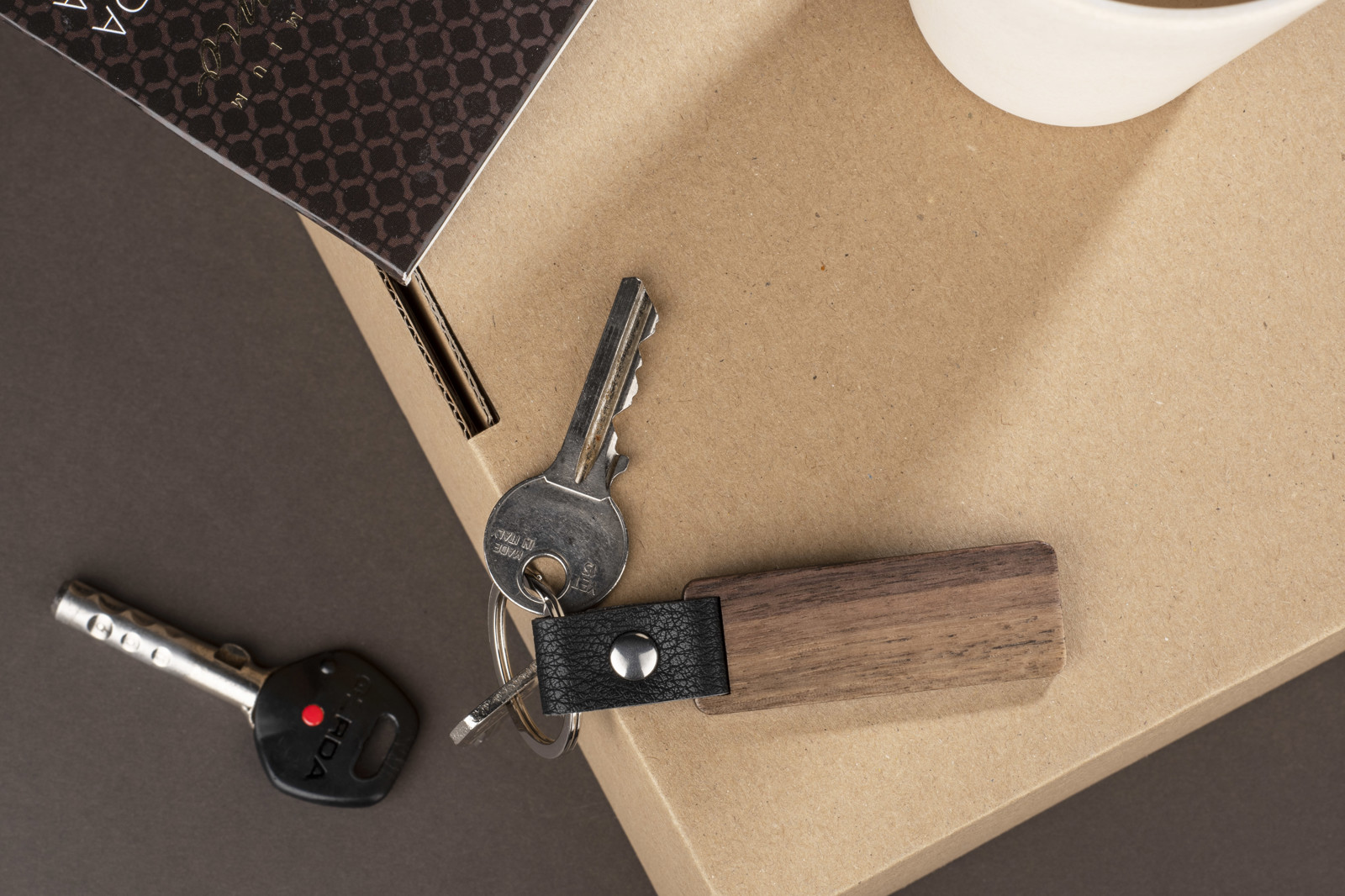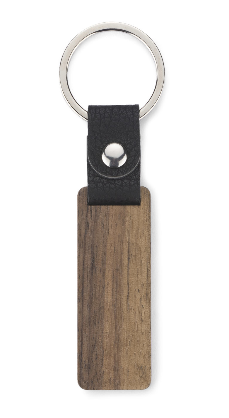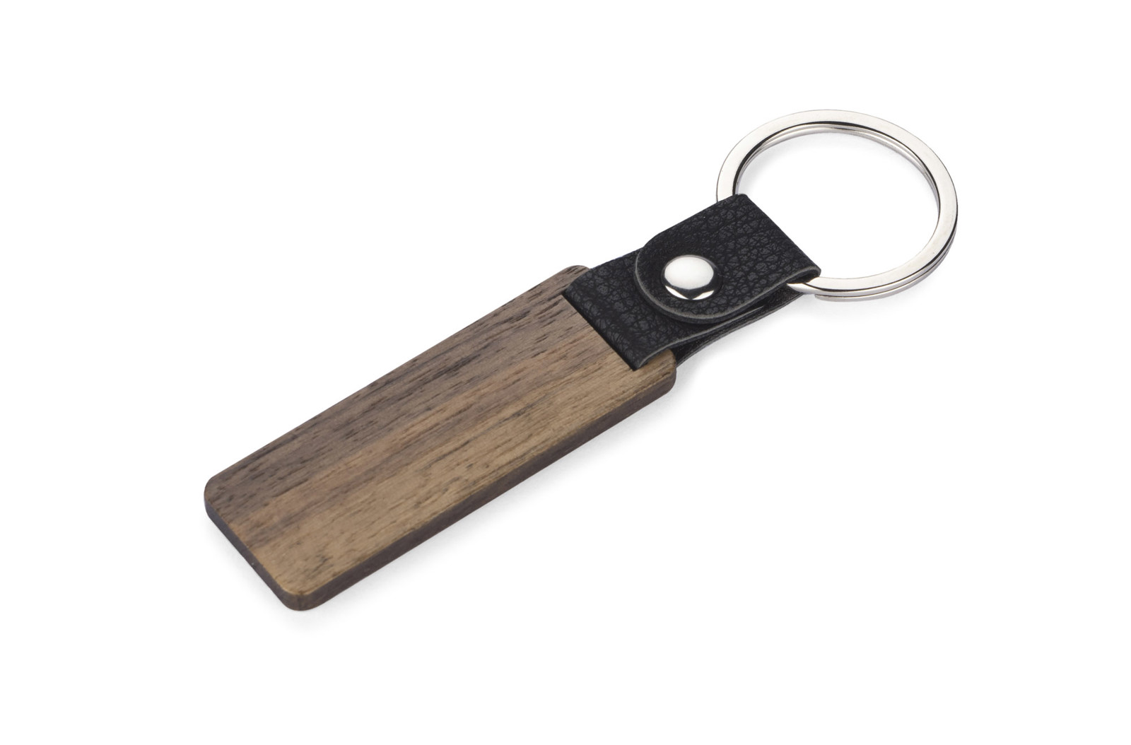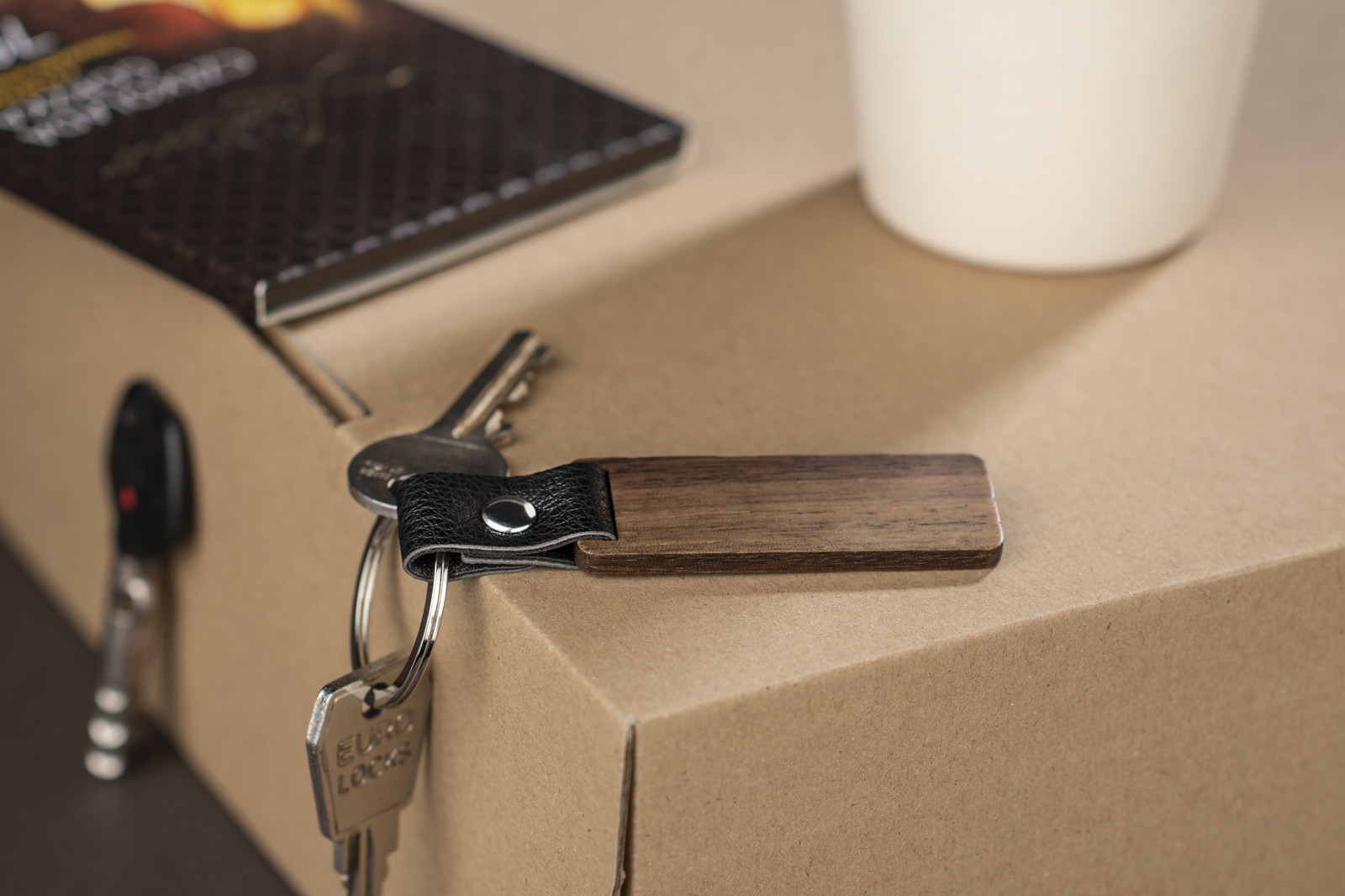The HASEL key ring is an elegant key ring made of walnut wood. The metal hoop is hung on a leather strap.