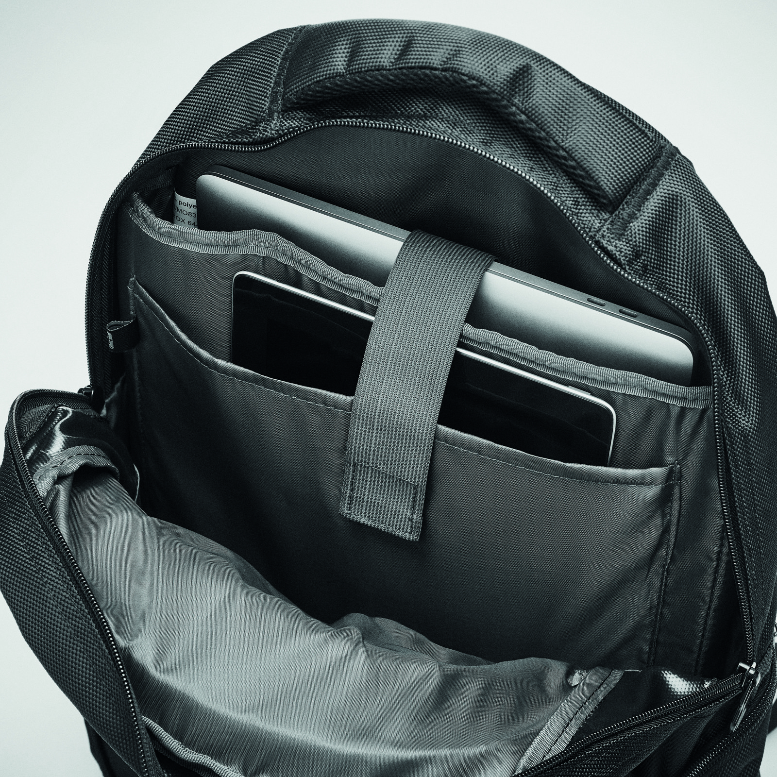 15 inch laptop backpack with compartments. Including several pockets and pen holder. Padded back and shoulder straps. 1680D polyester.