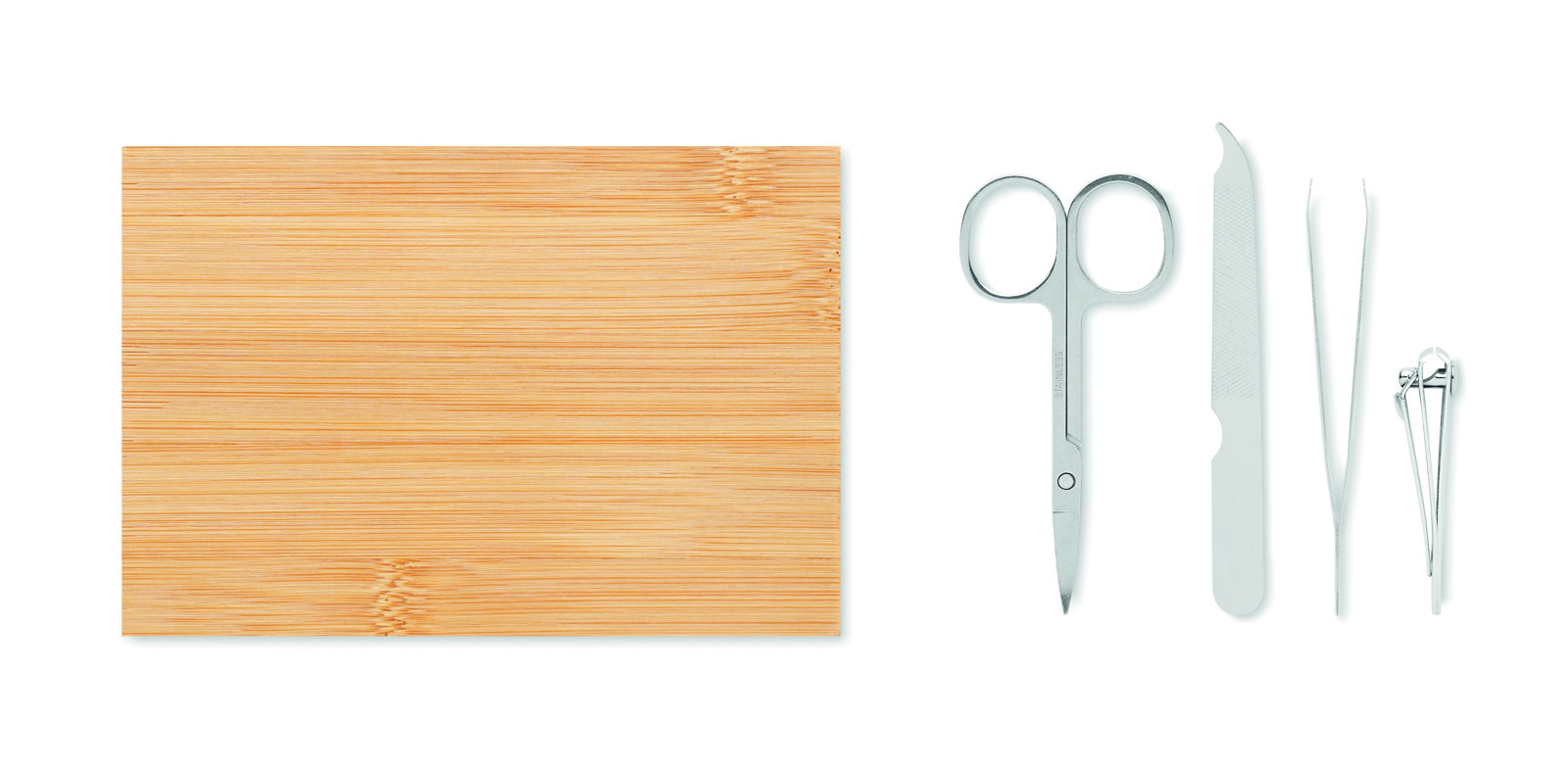 4 piece stainless steel manicure set in a bamboo case with magnetic closure. Including: curved nail scissors, nail clippers, nail file and tweezers. Bamboo is a natural product, there may be slight variations in colour and size per item, which can affect the final decoration outcome.