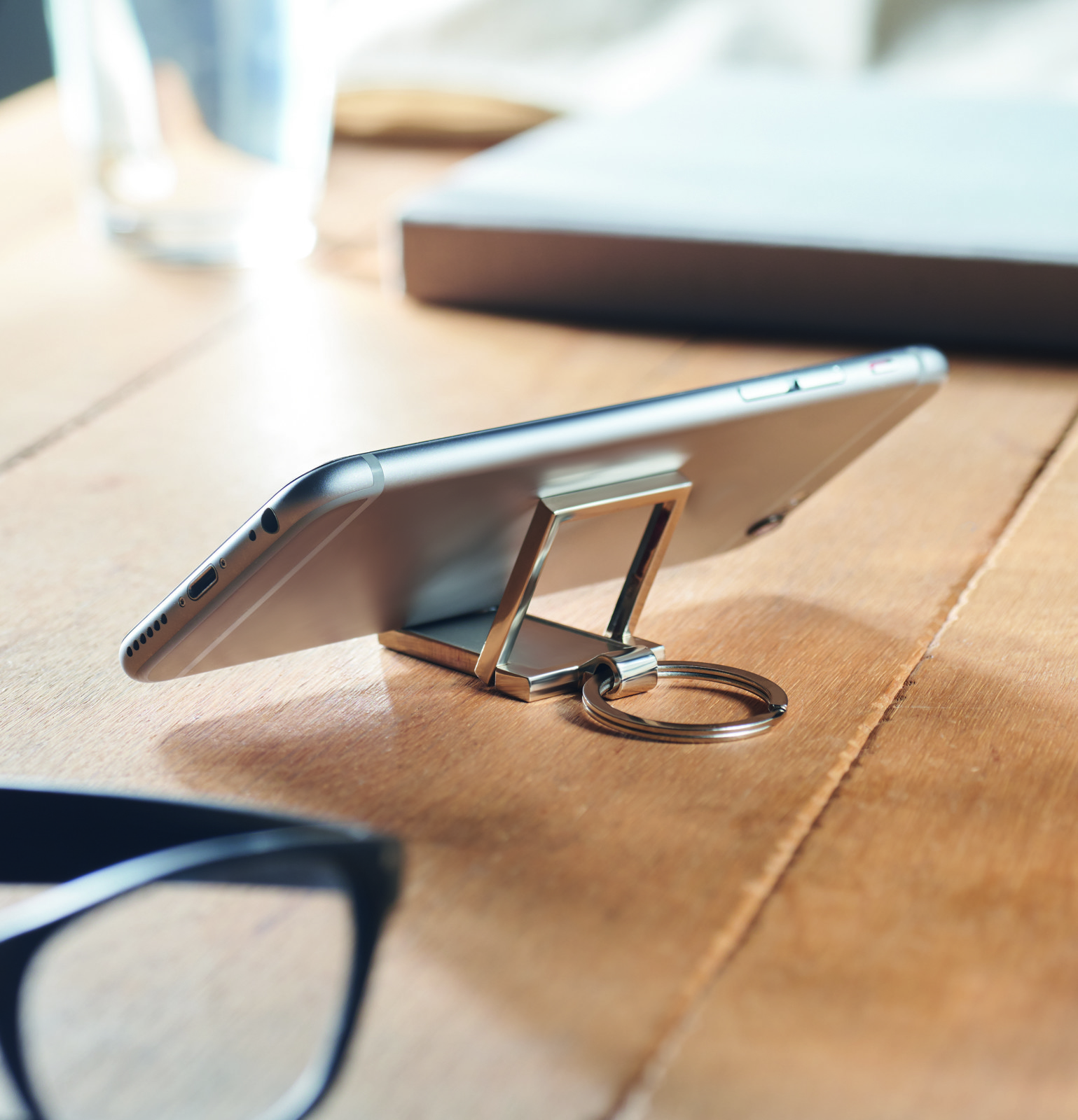 Metal key ring with phone stand.