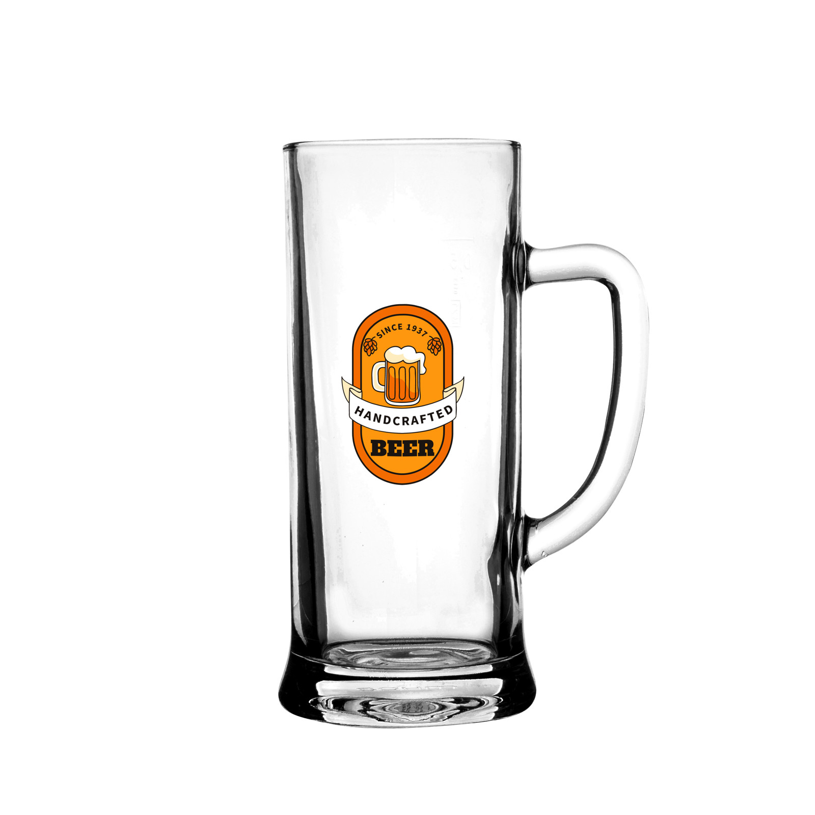 A tall beer mug with straight walls made of thick-walled glass. It has a comfortable handle and great decoration possibilities. Produced in Europe.
