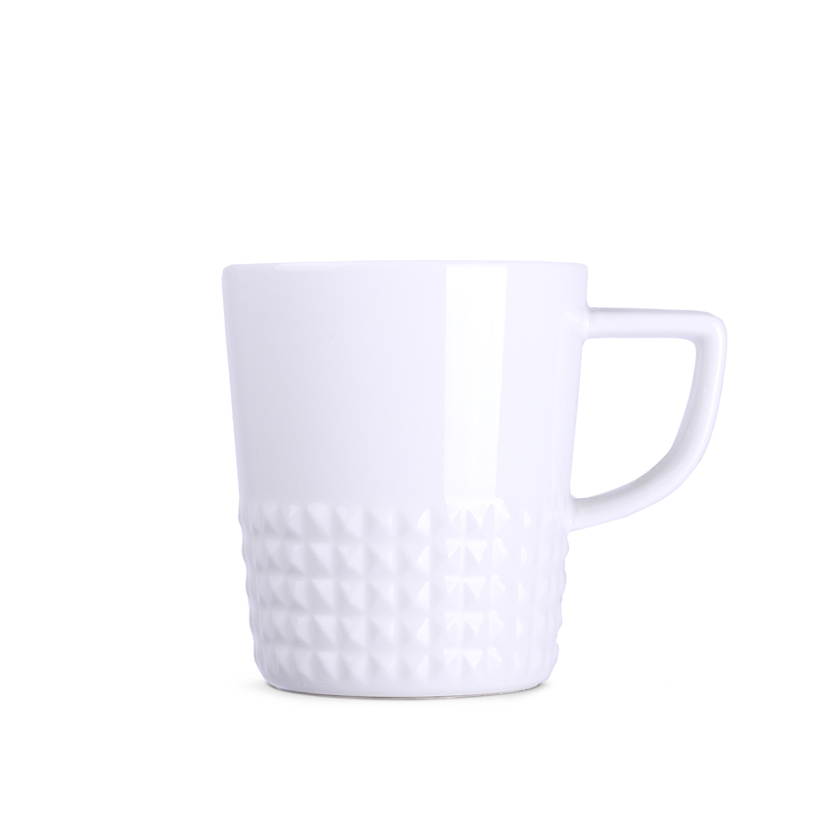 Designer, elegant mug made of high-quality porcelain. It has a modern handle and protrusions that give it a unique character. Perfect for applying original designs.