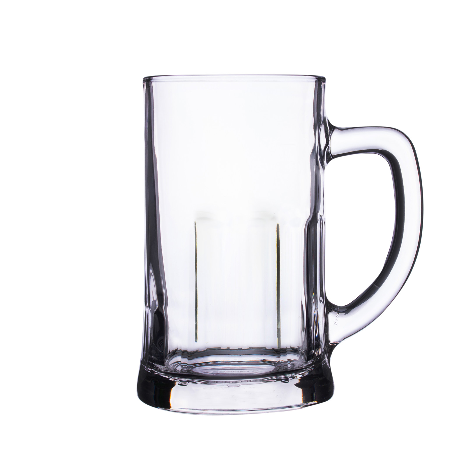 Massive beer mug with thick walls. It has a comfortable handle and characteristic grooves at the bottom.