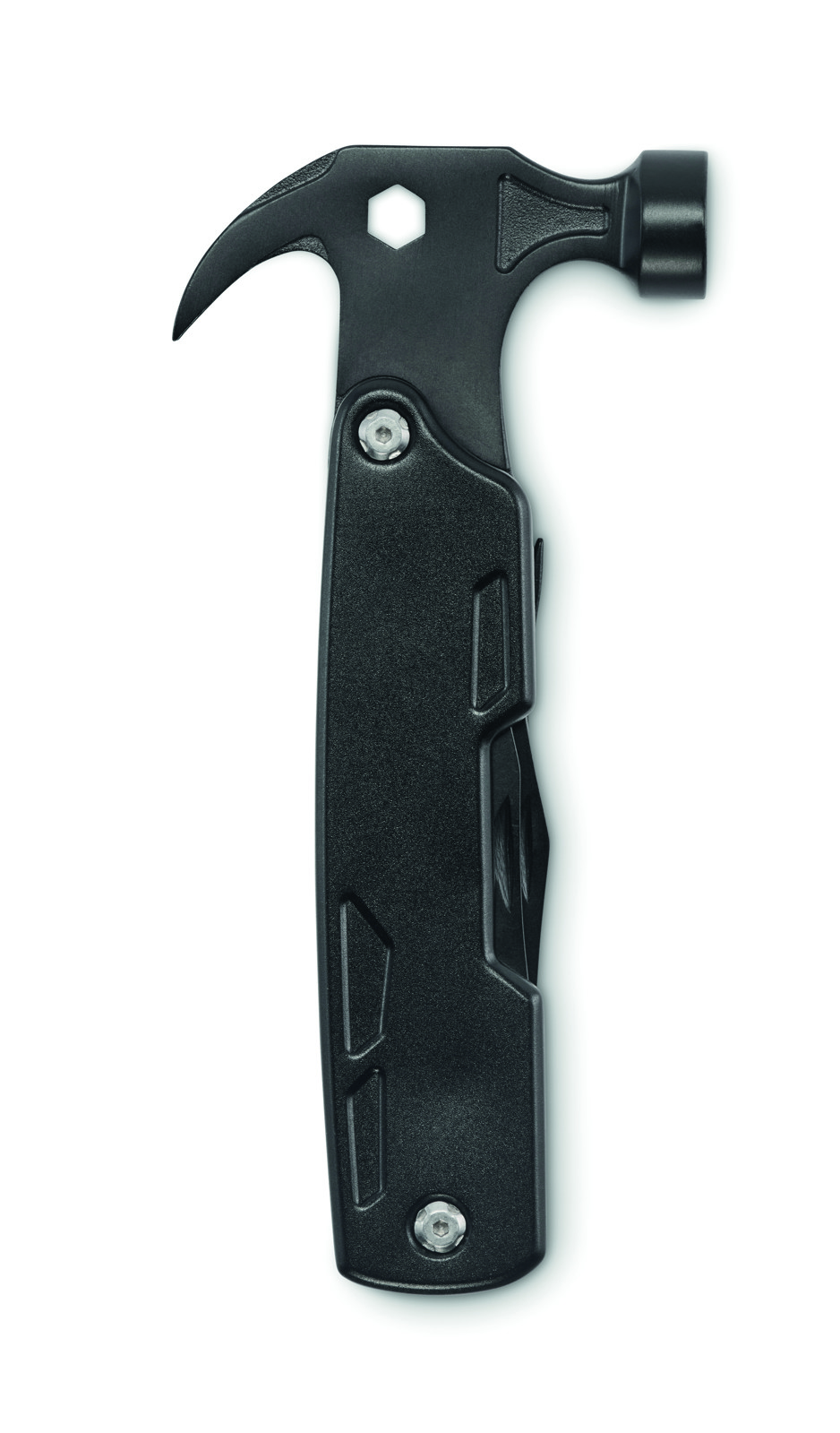 14-in-1 stainless steel multi tool hammer. With nail puller, hex wrench, serrated knife, steel file, variety of screwdrivers, regular pliers, needle-nose pliers, bottle opener, knife, wire cutter.