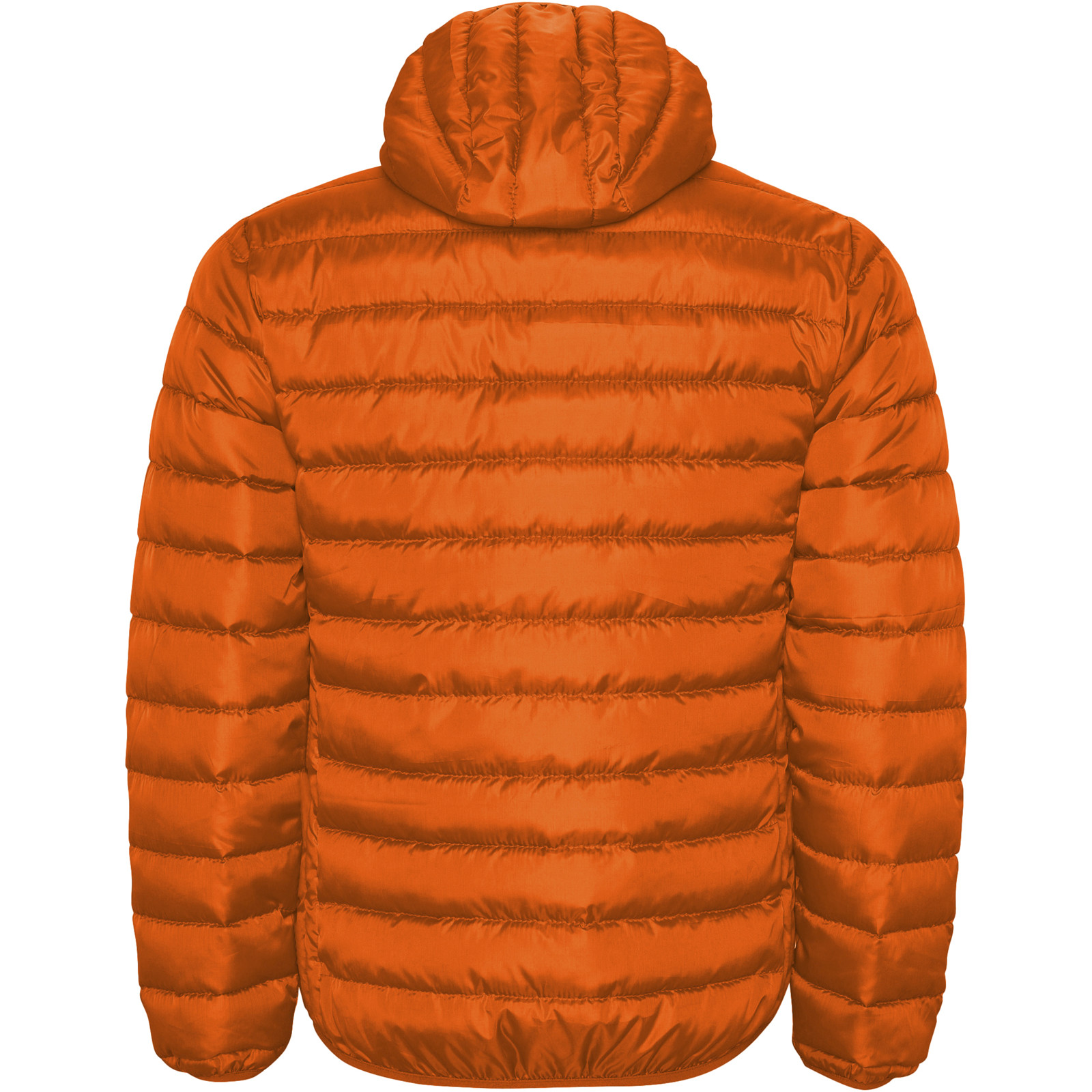 Men's feather touch quilted jacket with fitted hood. Inverted zips with matching chin protector. Two front pockets with zip. Matching elastic trim in cuffs, hem and hood. Contrasting inner lining. Light and foldable garment. Water resistant. Wind-proof model.