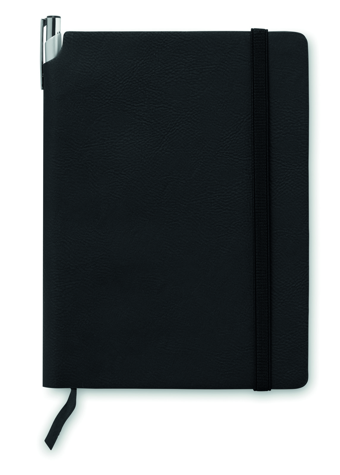 A5 notebook with soft PU cover. Casebound. 160 lined recycled paper pages (80 sheets). Matching elastic closure strap and ribbon bookmark. Expandable inner pocket in the back. Pen holder in the spine.