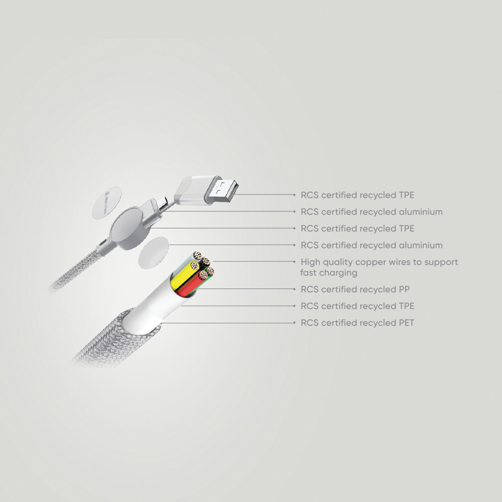 Always charge using the fastest charging speed possible with the Oakland fast charging cable. Made with certified recycled materials. The case is made out of 100% RCS certified recycled TPE plastic and the wire from 100% recycled TPE inner material and 100% recycled PET outer layer. RCS (Recycled Claim Standard) is a standard to verify the recycled content of a product throughout the whole supply chain. RCS is the standard that is used when a part of the item has been made from recycled materials. The 120 cm cable has 5 different connectors: USB C in, USB A in, type C out, IOS out and micro USB out. This also allows you to use the cable with type C output devices that are included in the newer generation of phones and macbook computers. The cable also has a USB A output input option so it can charge any device from any output source. Max current type C to lightning 18W. Max current type C to type C 45W. Urban Vitamin items are made without PVC and packed in plastic reduced packaging.