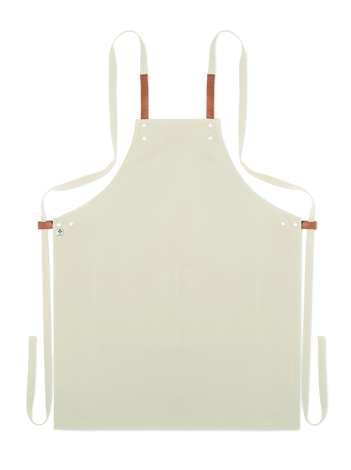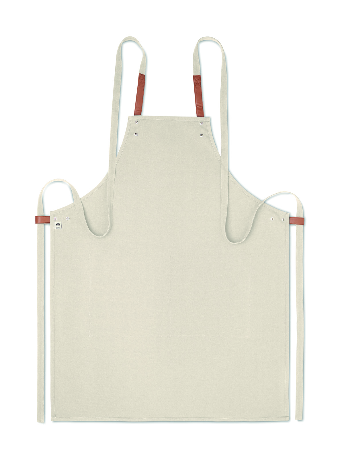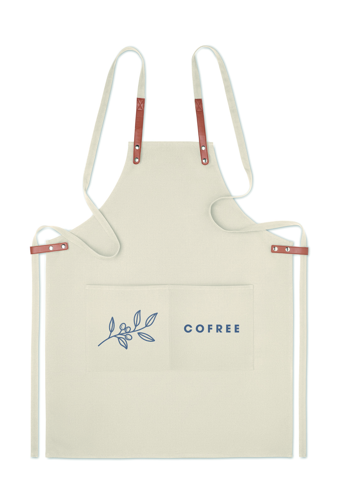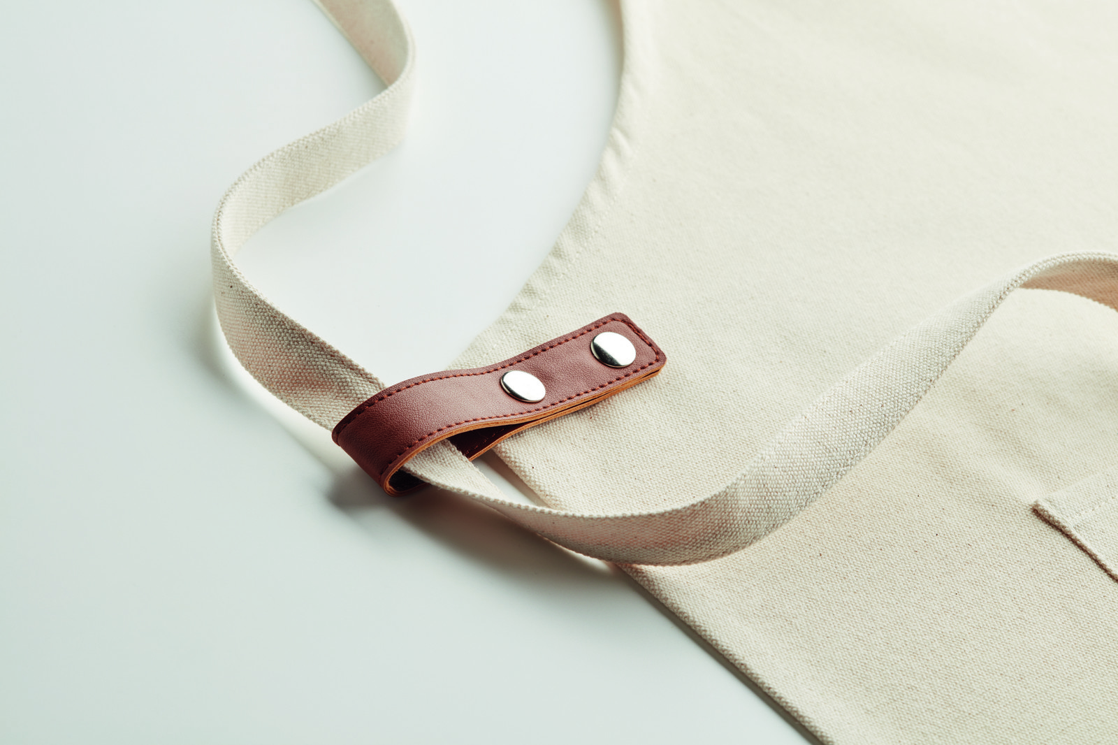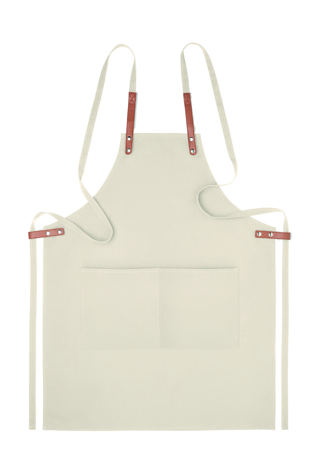 Adjustable kitchen apron with 2 front pockets in 340 gr/m² organic cotton/canvas.