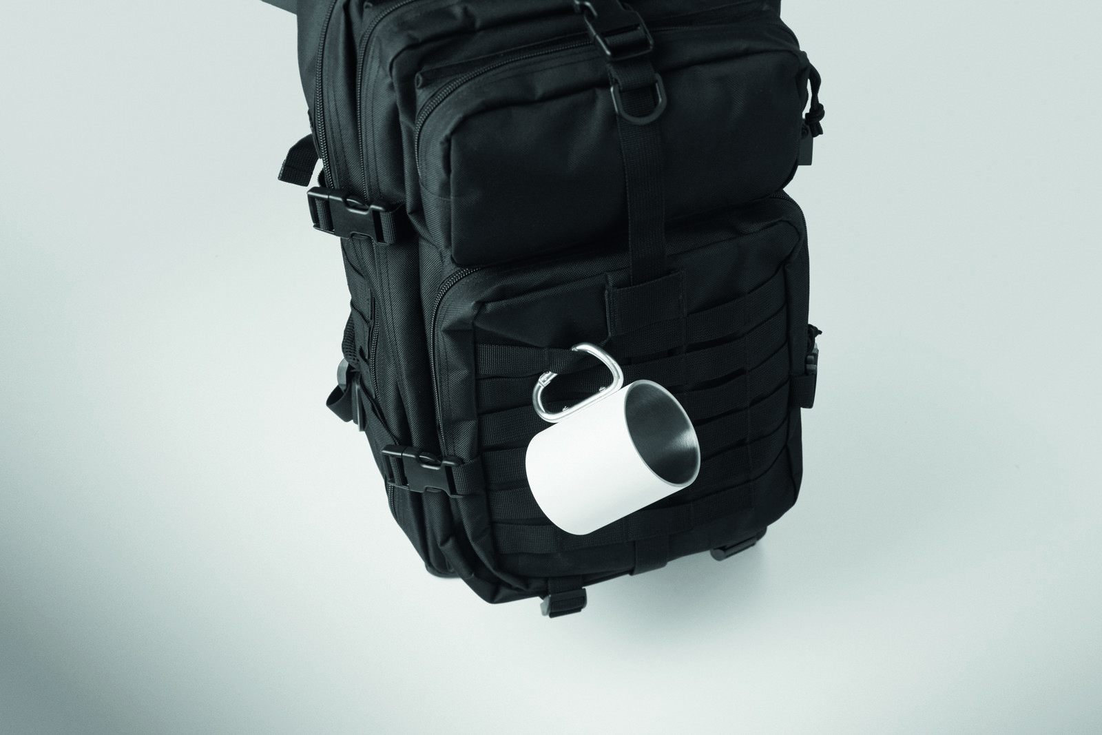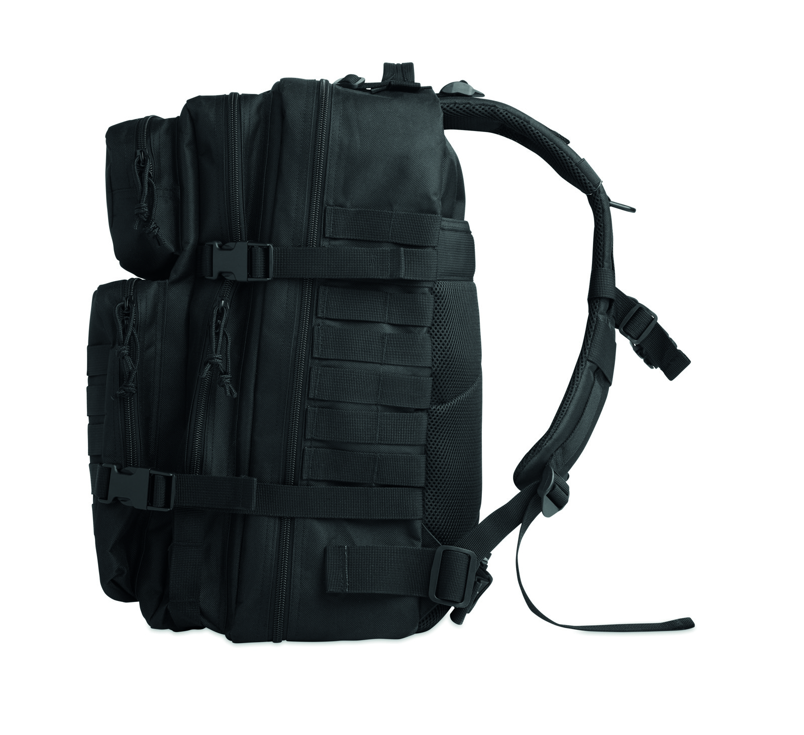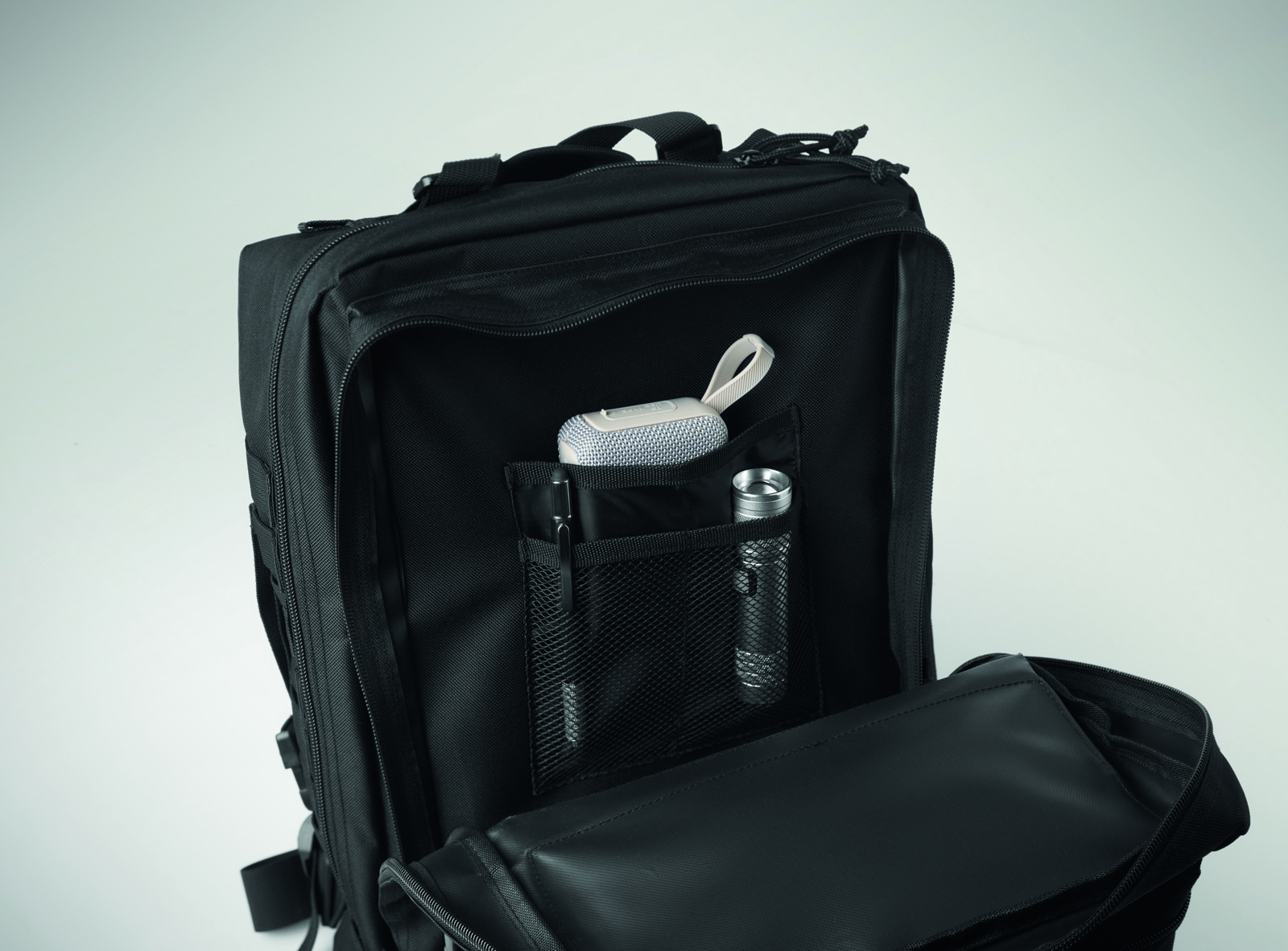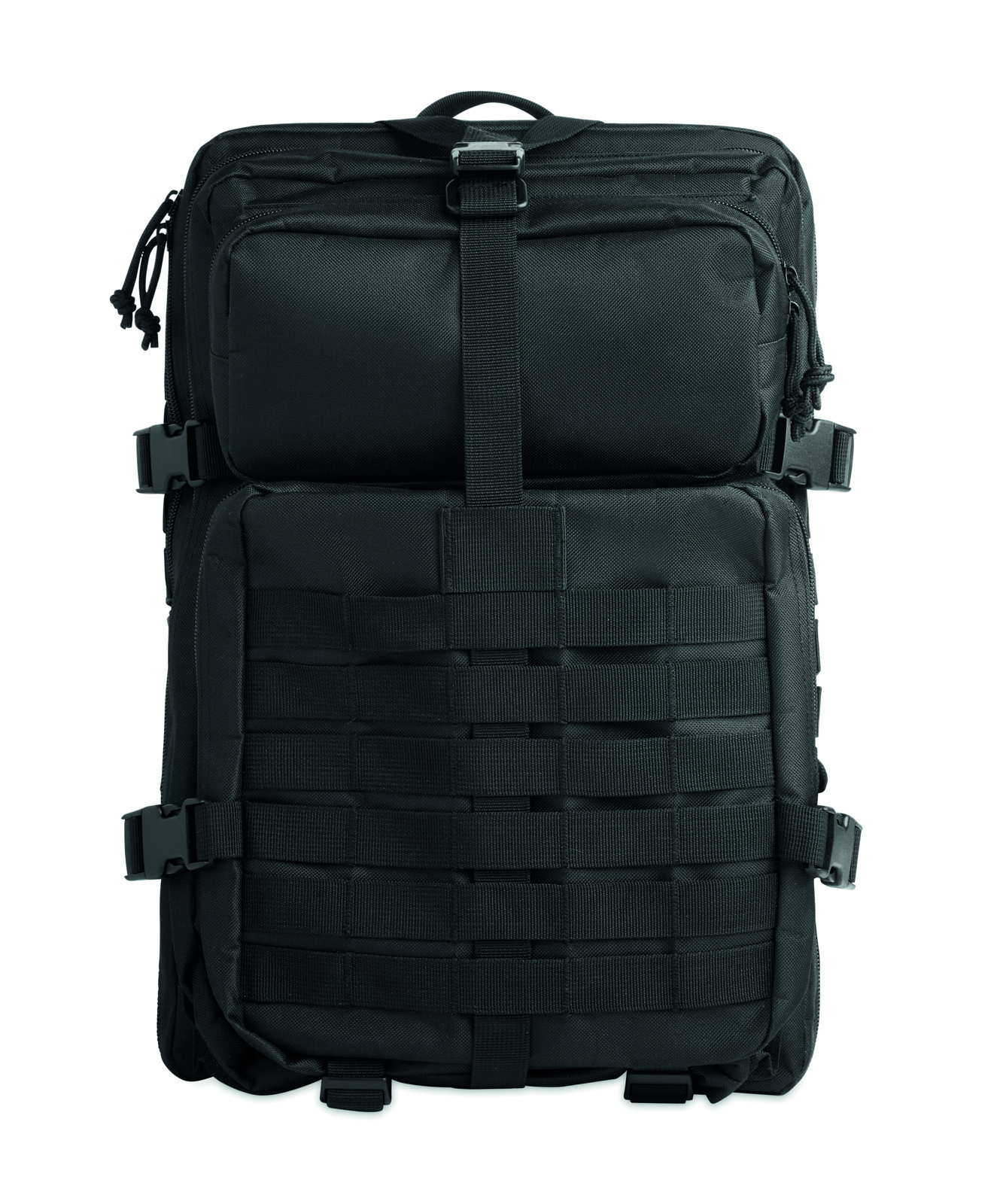 Outdoor 50L backpack in 600D RPET with padded laptop compartment and several inner compartments, zip front pockets, mesh padded straps and back, hip belt, and elastic supports for accessories.