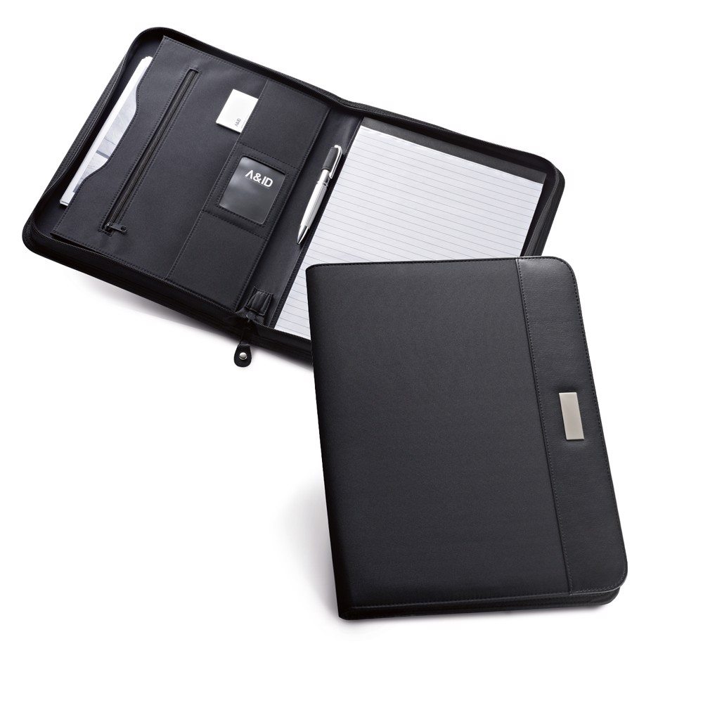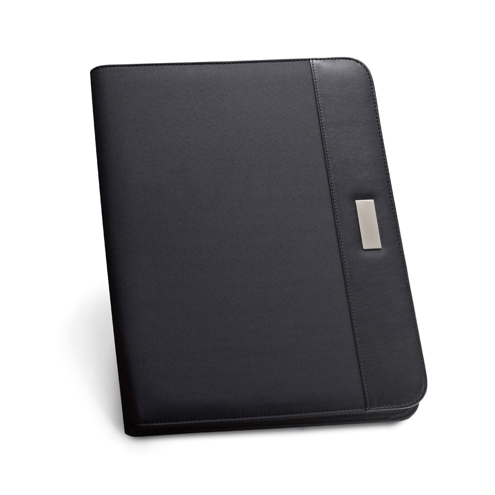 PU and microfibre A4 folder, with zip fastening. The folder contains several interior pockets, 40 lined pages pad (60 g/m²) and a pen holder (pen not included). Plate available for customization. 245 x 325 x 40 mm | Plate: 16 x 45 mm
