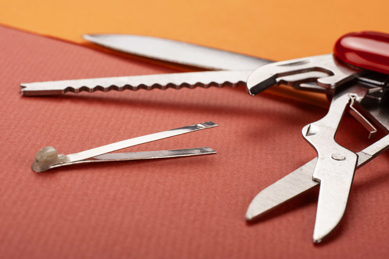 The HIDI pocket knife with a red plastic handle. This gadget have all necessary features: knife, saw, fish scrapper, scissors, can opener, bottle opener, screwdriver, corkscrew, awl and leather punch.