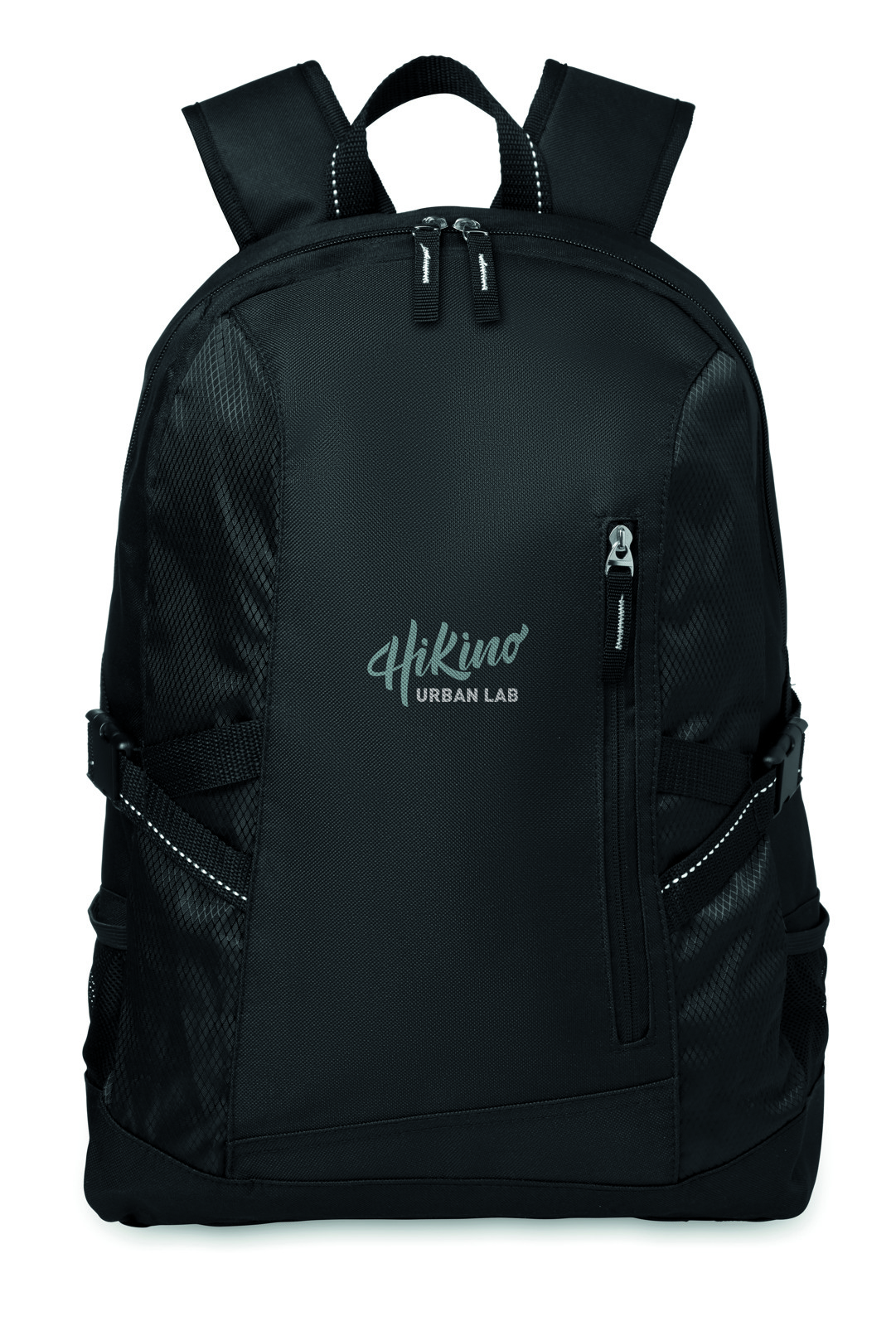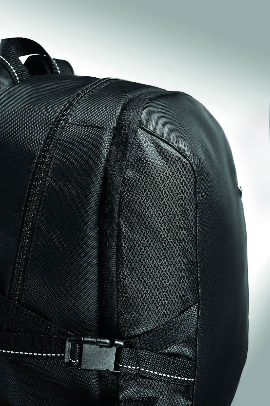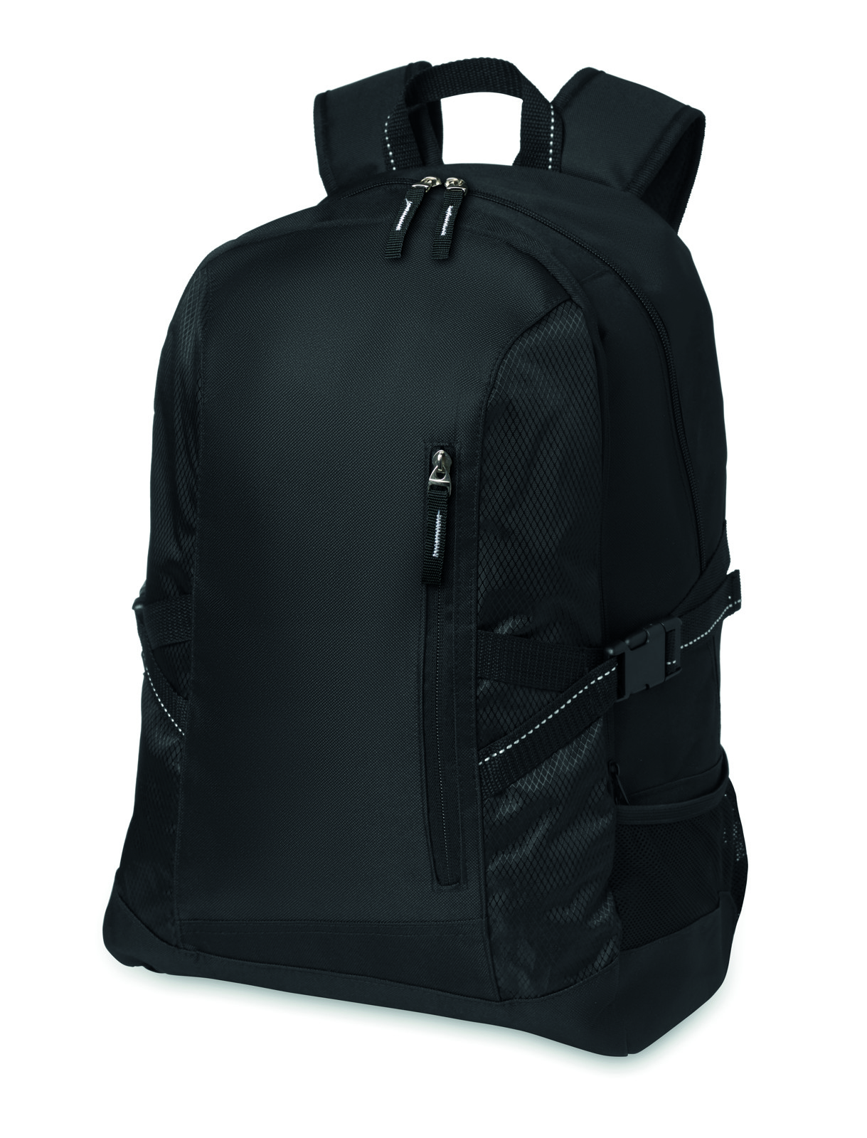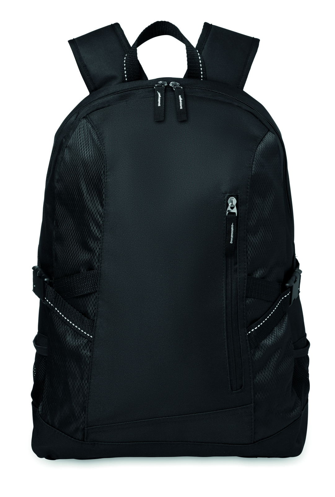 15 laptop backpack in 600D with rip stop details. Includes one internal 15 laptop compartment, one main front zippered pocket and 2 side compartments. Adjustable shoulder strap.