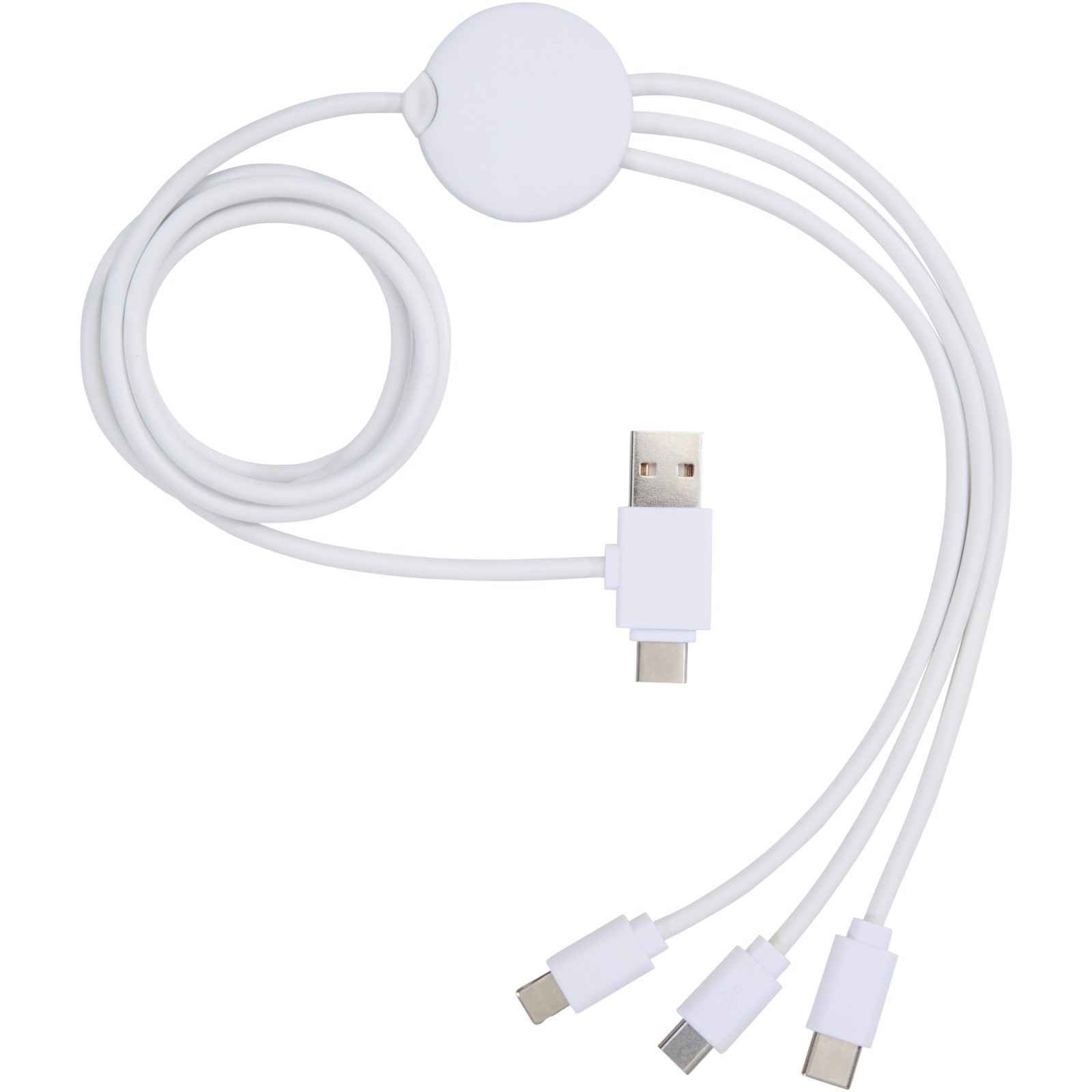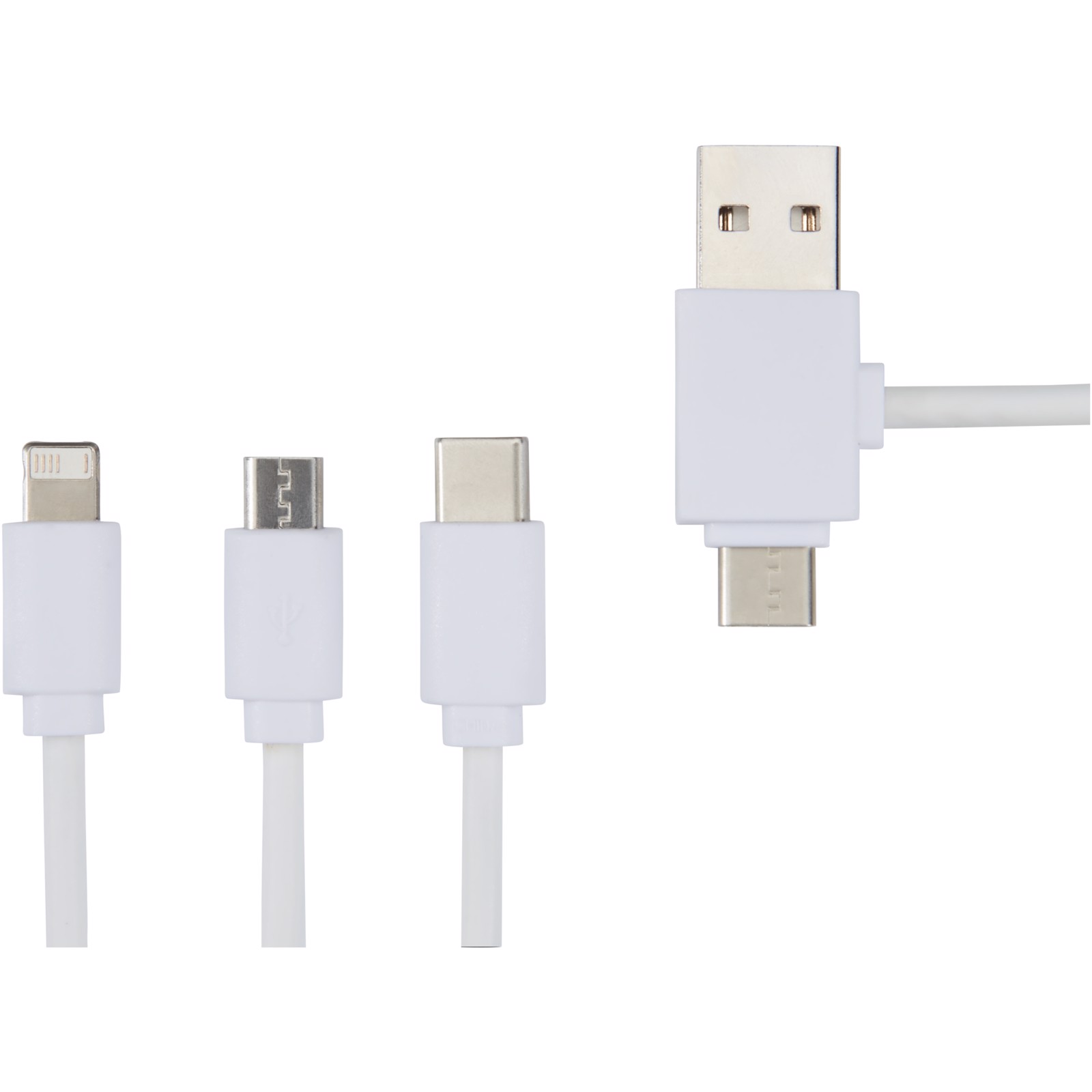 Charging cable with antibacterial additive and 5 different connectors: Type-C input, USB-A input, Type-C output, iOS output, and micro USB output. This allows for using the cable also with Type-C output devices that are included in the newer generation of phones and macbook computers. Cable length is 100 cm. The antibacterial additive is able to effectively reduce the bacterial levels present on the surfaces of the material, with high effectiveness in inhibiting the growth of bacteria and fungi responsible for creating unpleasant smells, staining and degradation of textile and plastic products. Tested according to ISO 20743:2013.
