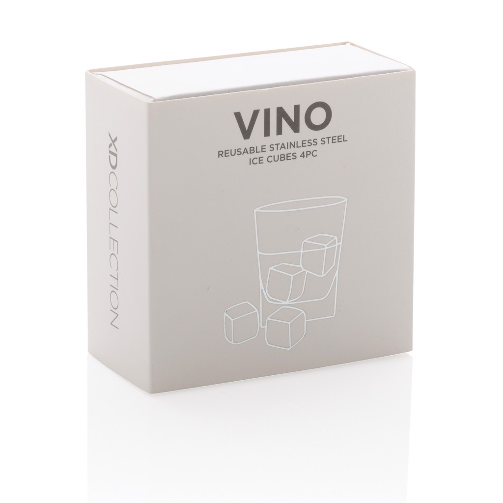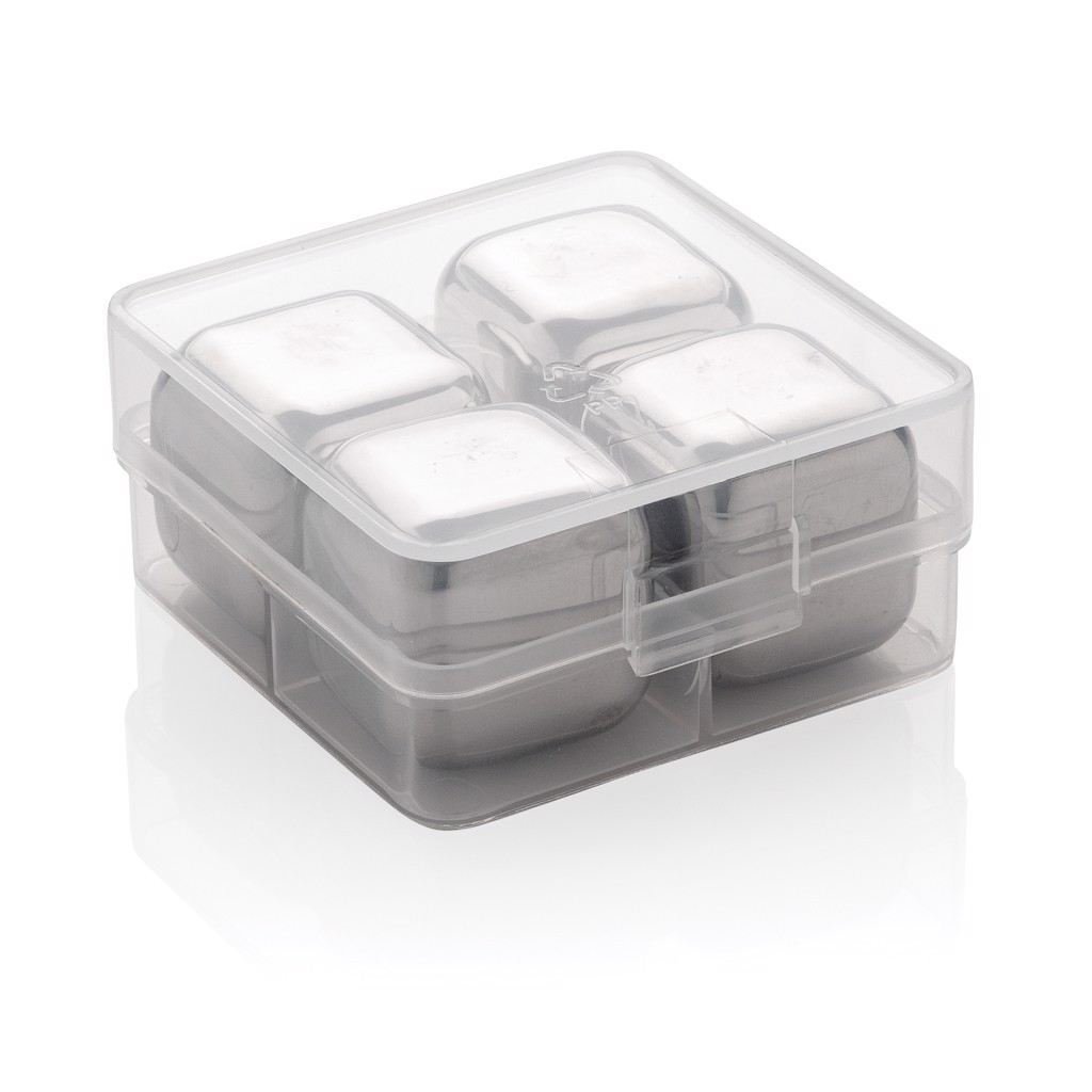 Enjoy your chilled drink with this set of 4 stainless steel ice cubes. The cubes help preserve the taste of your favourite drink with no dilution. The set comes in a handy storage box.They are simple to use: just store them in your freezer and they are ready to use in just 3 hours! Size of the cube 2.5x2.5x2.5cm.