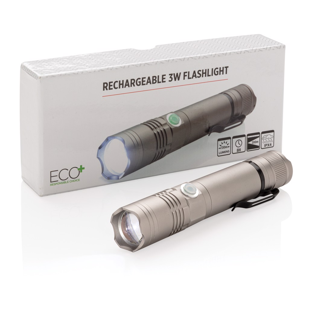 Long lasting rechargeable flashlight that can be re-charged time after time so no need to replace batteries making this torch a sustainable choice. This aluminium 3W flashlight produces 130 lumen and a beam up to 200 metres. Includes 3 light modes: bright, low beam and flashing. With its IPX 4 rating it’s also suitable to use in bad weather conditions. With built-in 2200 mAh lithium battery that allows a usage time up to 8 hours. Re-charging takes approximate 2 hours. Including micro USB cable for re-charging via USB outlet.