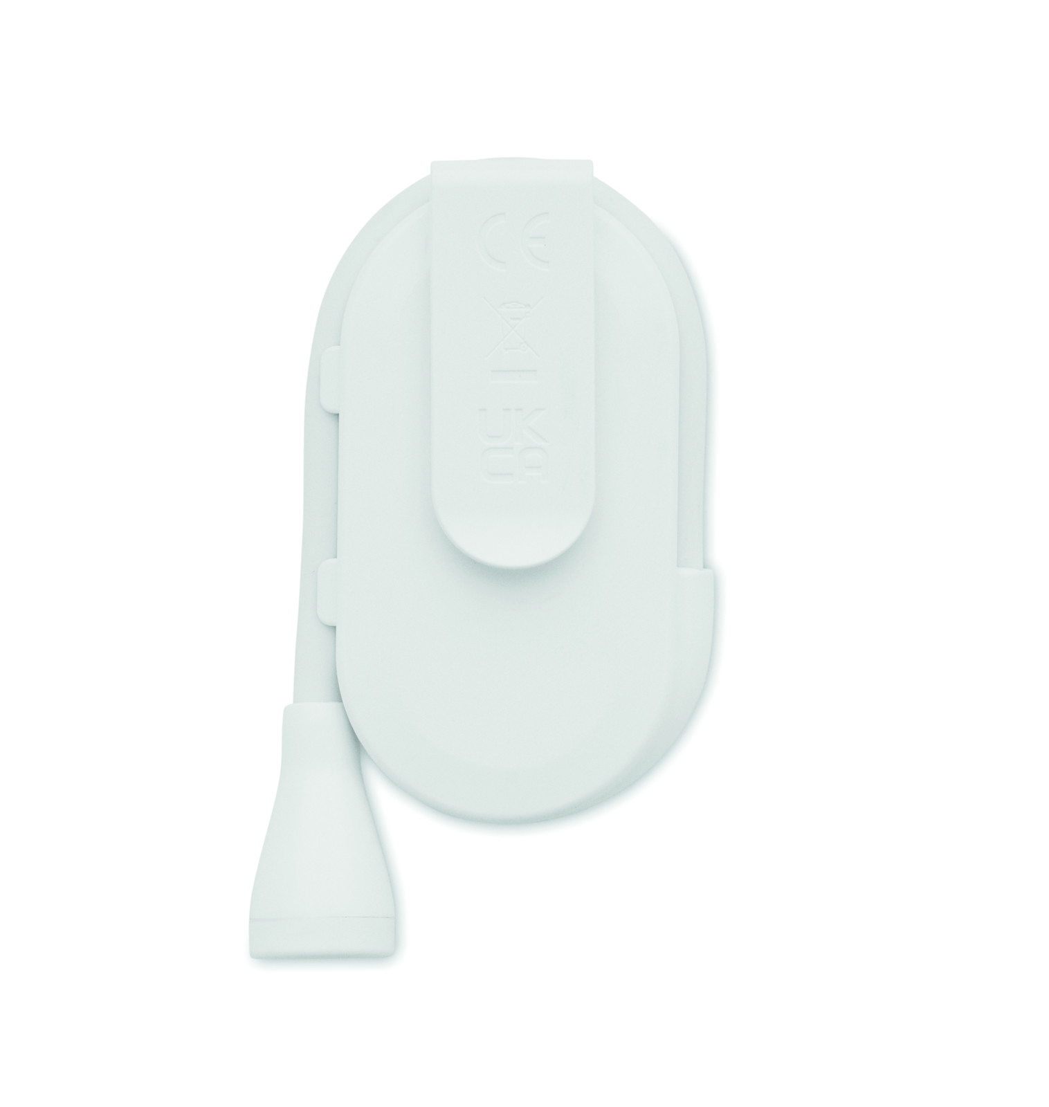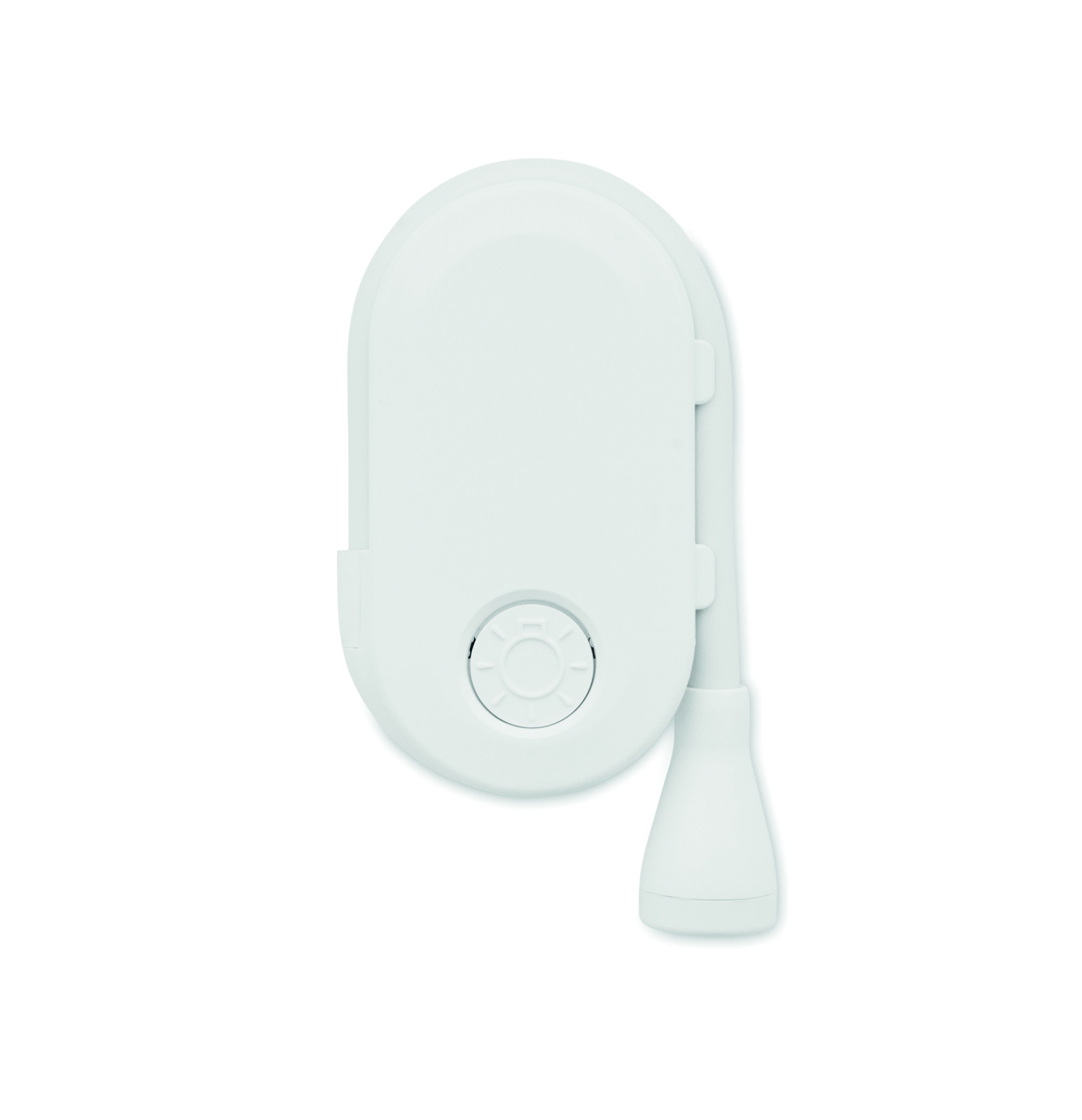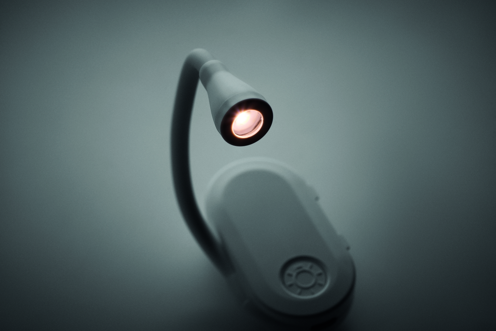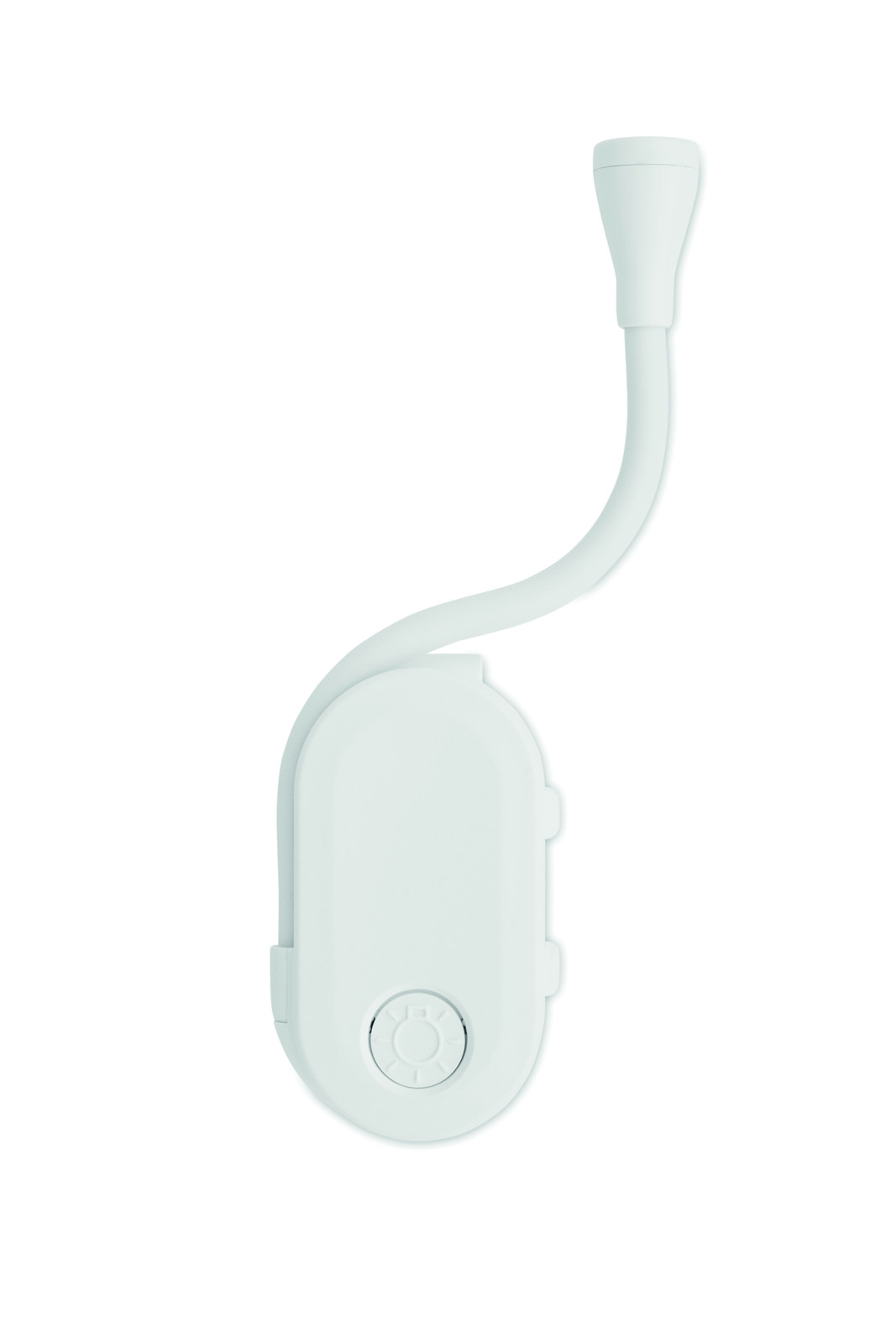 Rechargeable LED book light in ABS with flexible body and clip. Features 3 light settings, 300mAh battery.