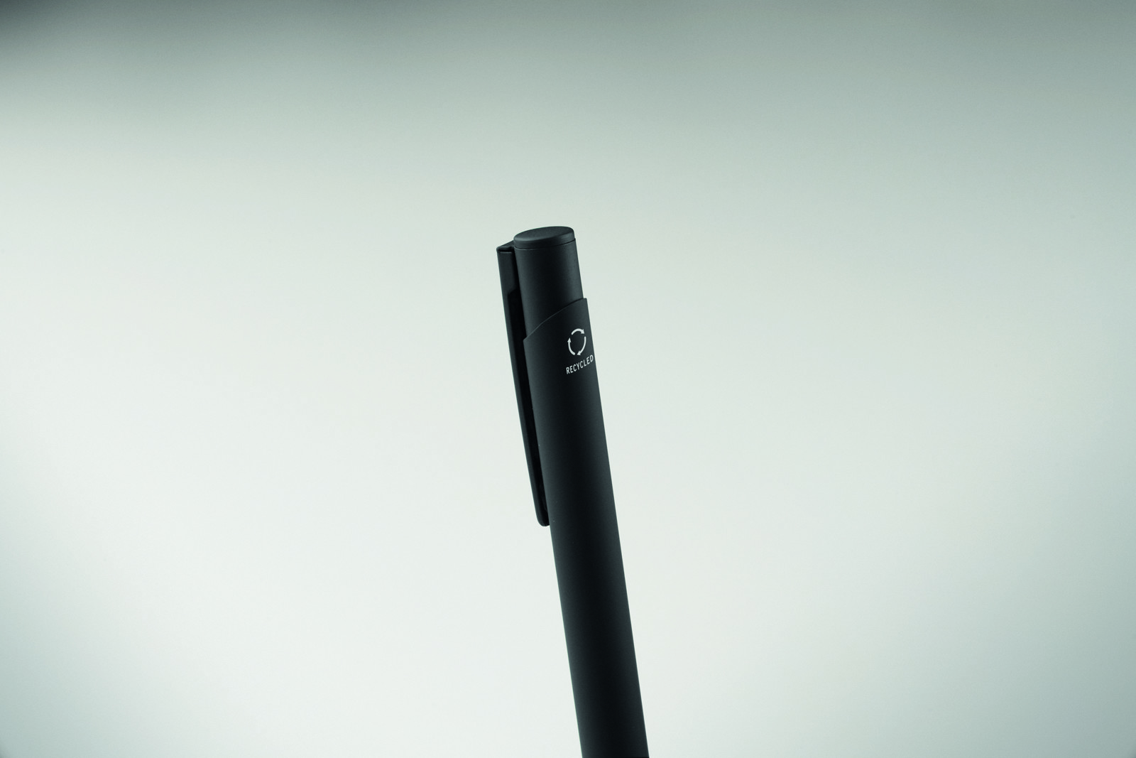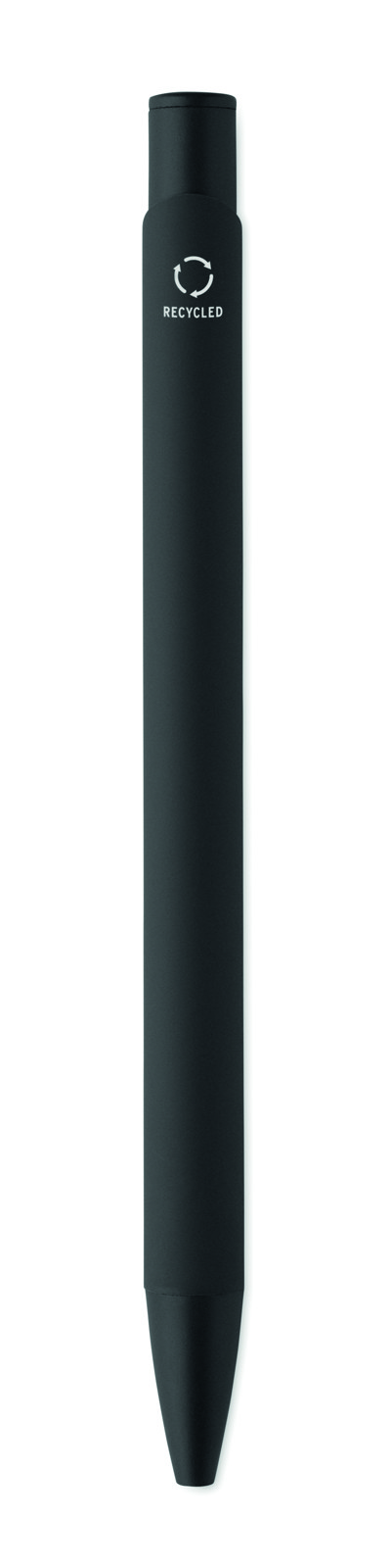 Push-type pen made of recycled aluminium with iron clip and colour rubberised barrel. Blue ink.