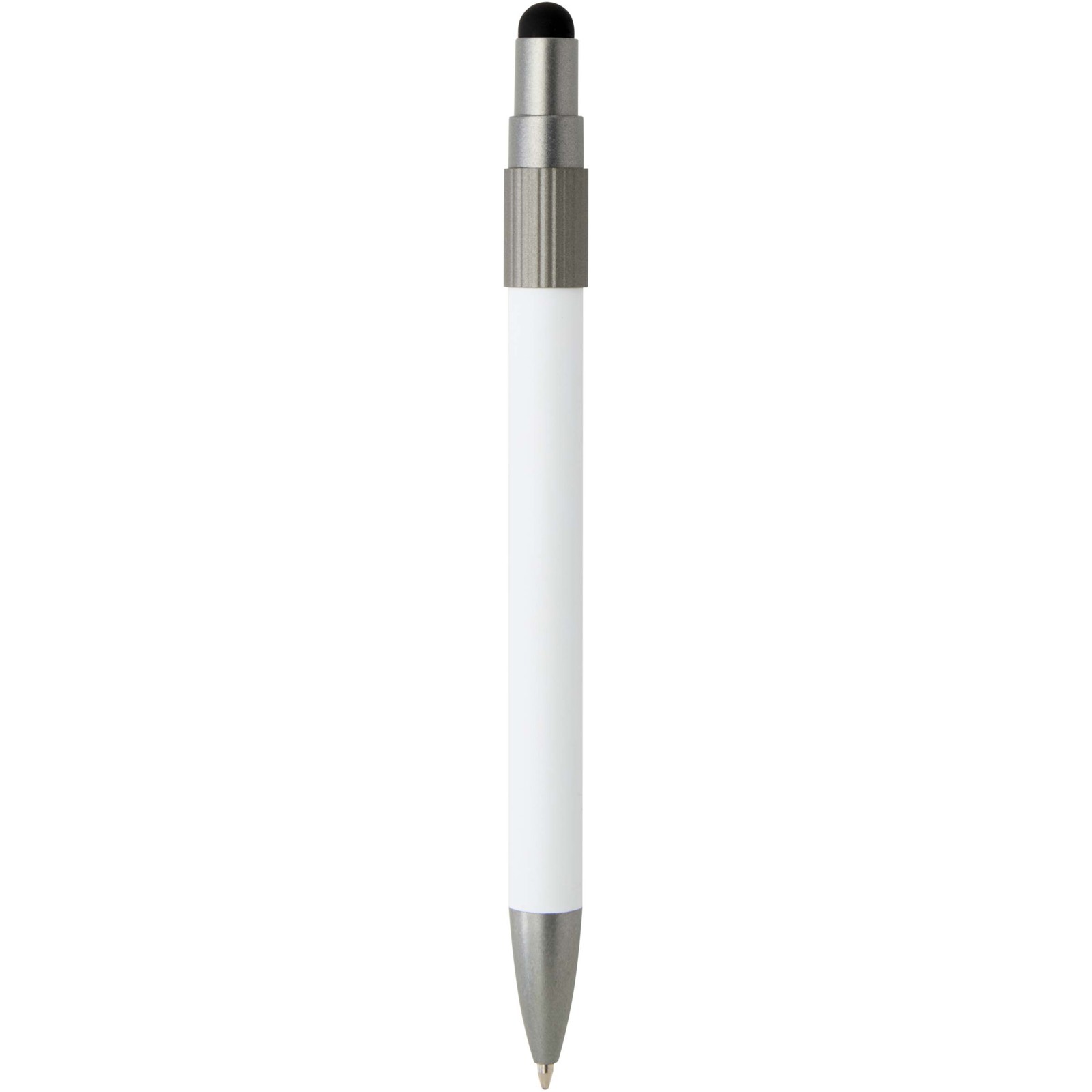 Ballpoint pen with stylus and fidget spinner, combining practicality with a playful design. The pen is made from RCS certified recycled aluminium and features a smooth push mechanism and a stylus tip for touchscreen use. A built-in fidget spinner on top adds a stress-relieving touch (just flick to activate). Pen ink colour: black. Writing length: 1000 metres.