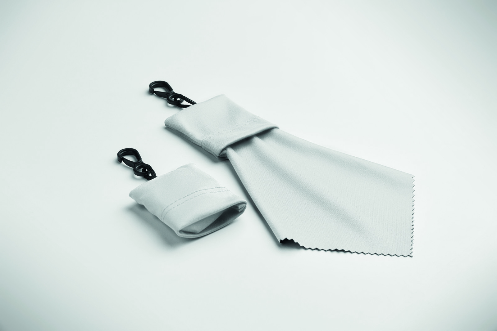 RPET cleaning cloth with self material pouch with PP plastic hanging hook.