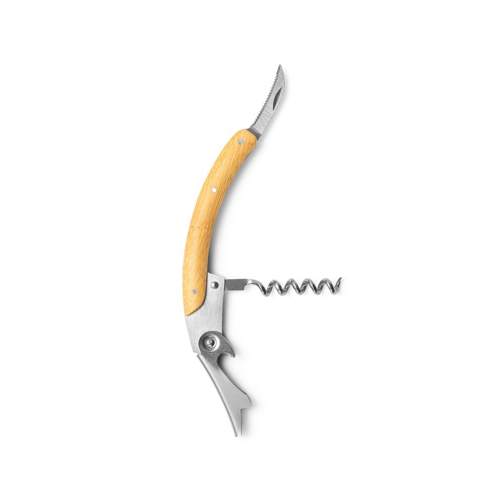 Bamboo and stainless steel wine set. Includes: 1 corkscrew, 1 stopper, and 1 metal ring. Supplied in a kraft paper gift box. Because this product is made from natural materials, product color and printing may vary between products. 160 x 100 x 27 mm