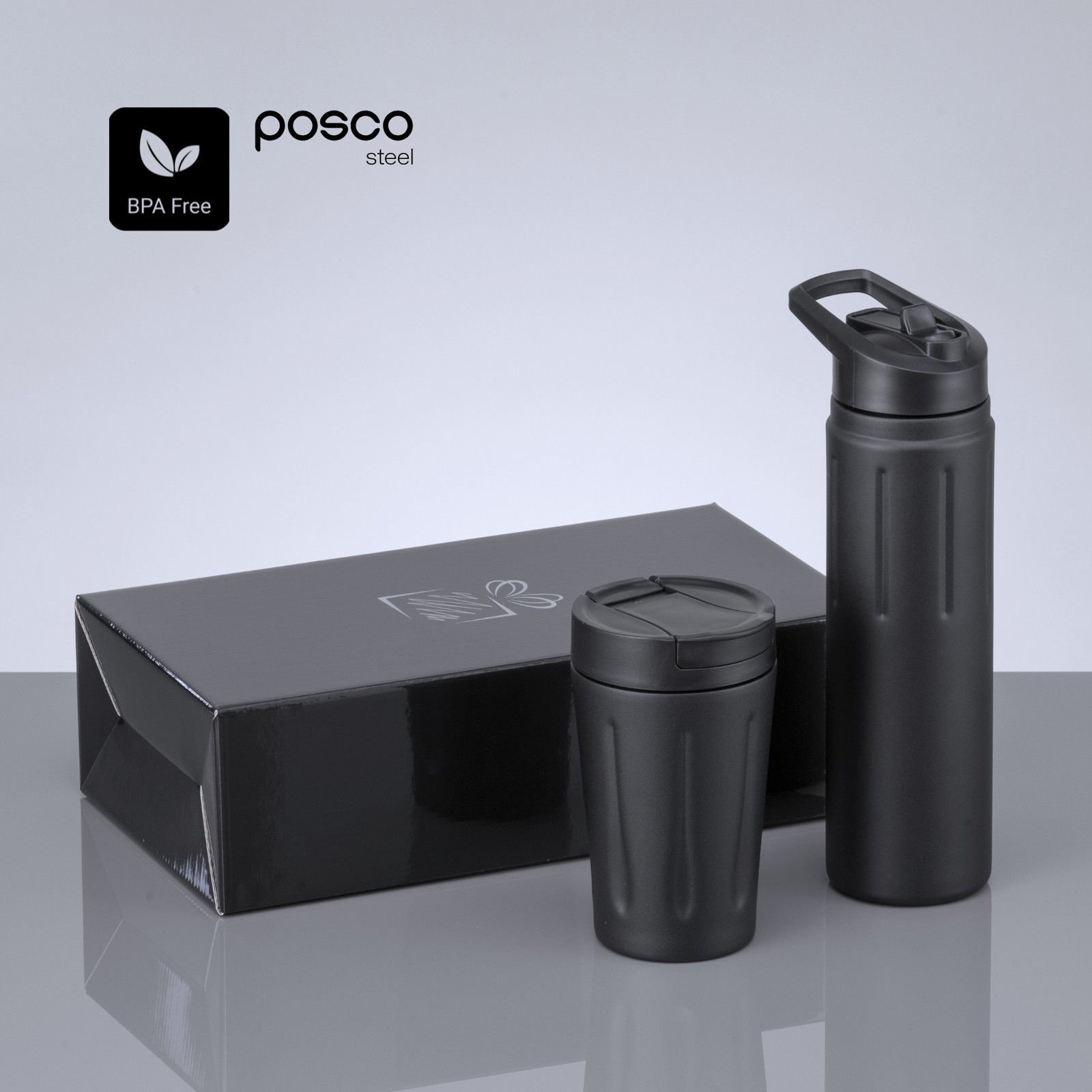A stylish and practical drinkware set made from premium POSCO stainless steel with added copper for improved insulation. The coffee cup features double-wall vacuum insulation, a dual-lock silicone gasket, and a powder-coated surface for a secure, comfortable grip. The 750 ml bottle offers durable, all-day hydration with a sleek design, making both items ideal for work, travel, or outdoor activities.