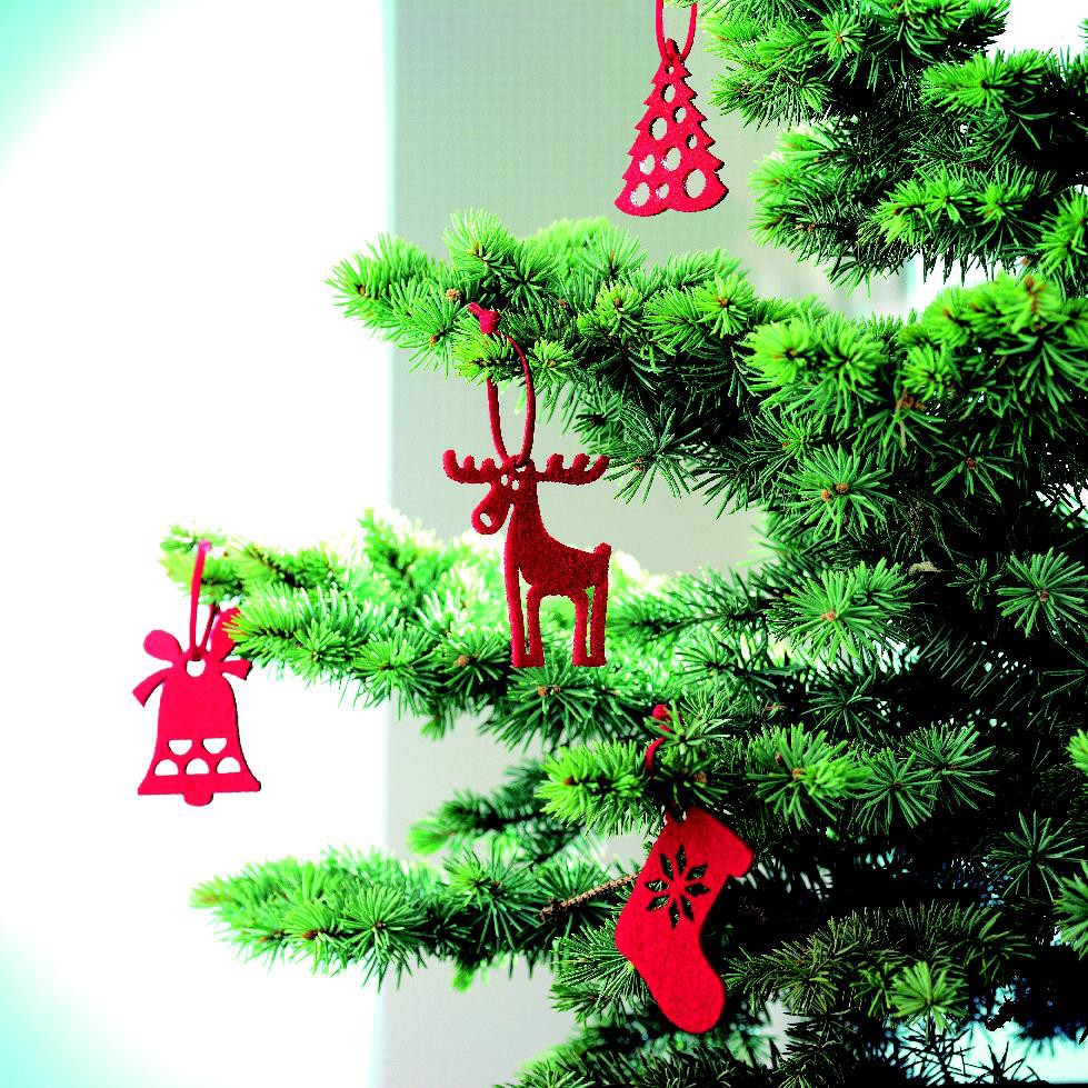 Set of 6 red felt tree hangers in 6 different designs: tree, snowflake, bell, boot, poinsettia and reindeer.