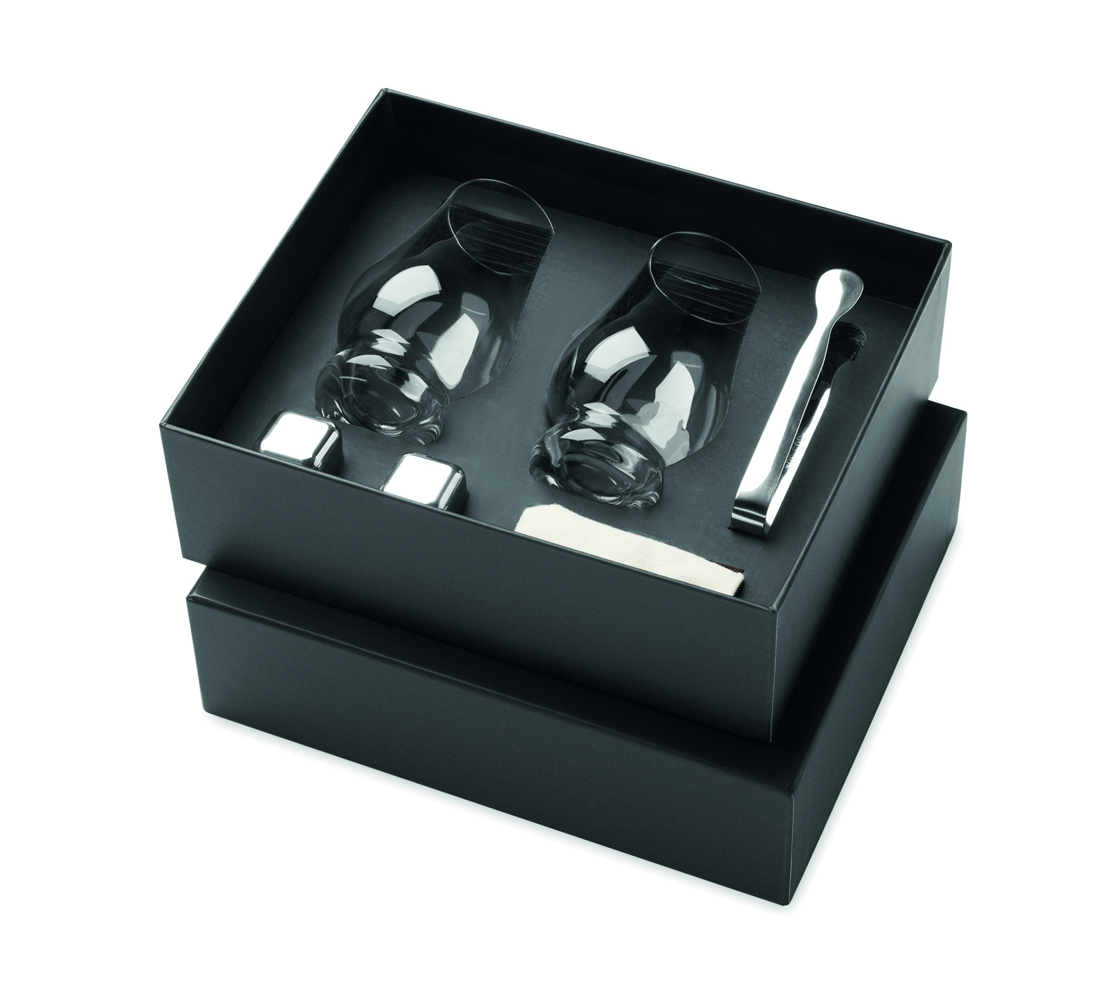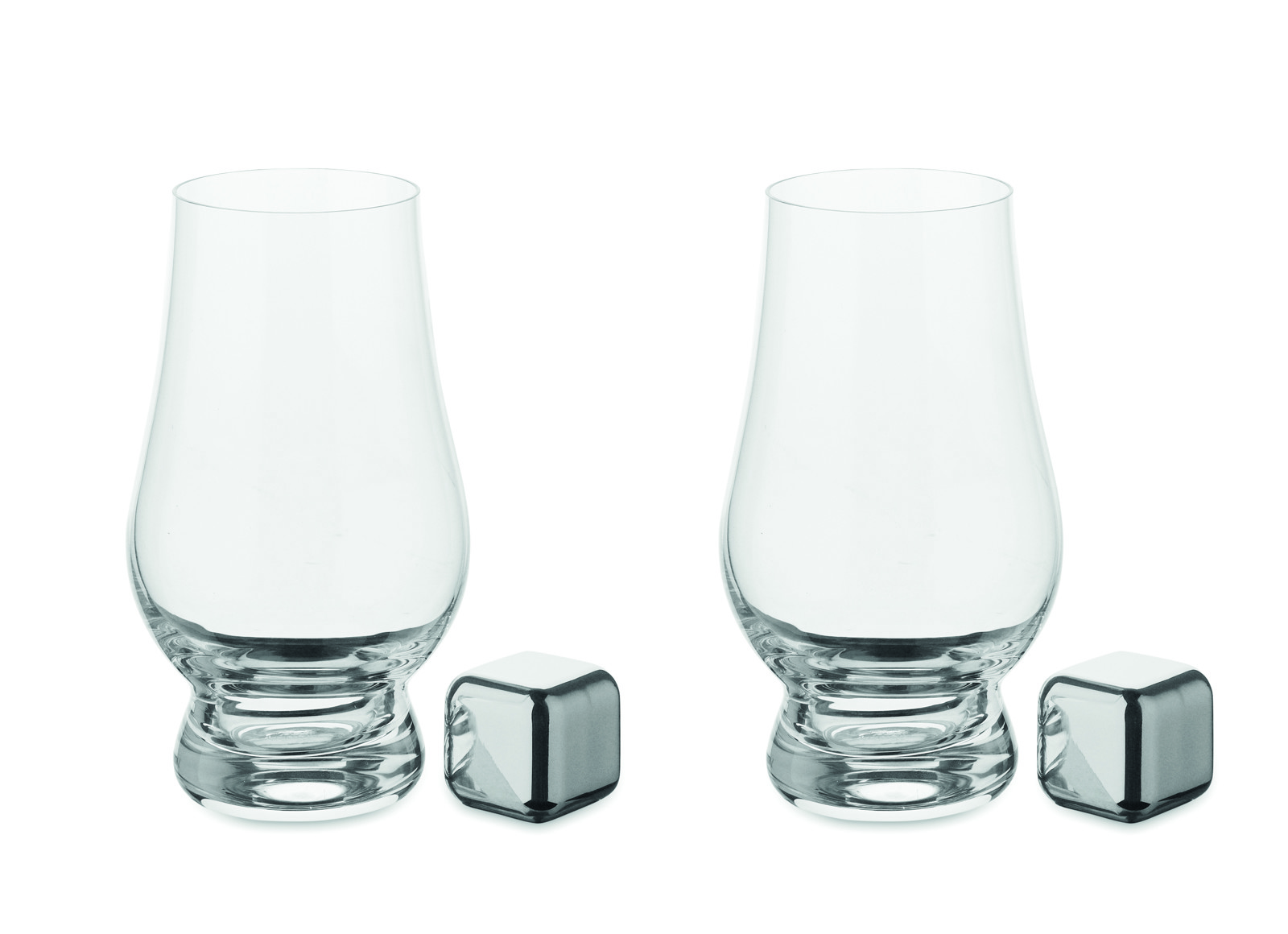 Set of 2 sniffer tasting glasses (200ml) for whisky or other liquors, 2 reusable stainless steel ice cubes, tongs and ice cube storage cotton pouch. Presented in gift box.